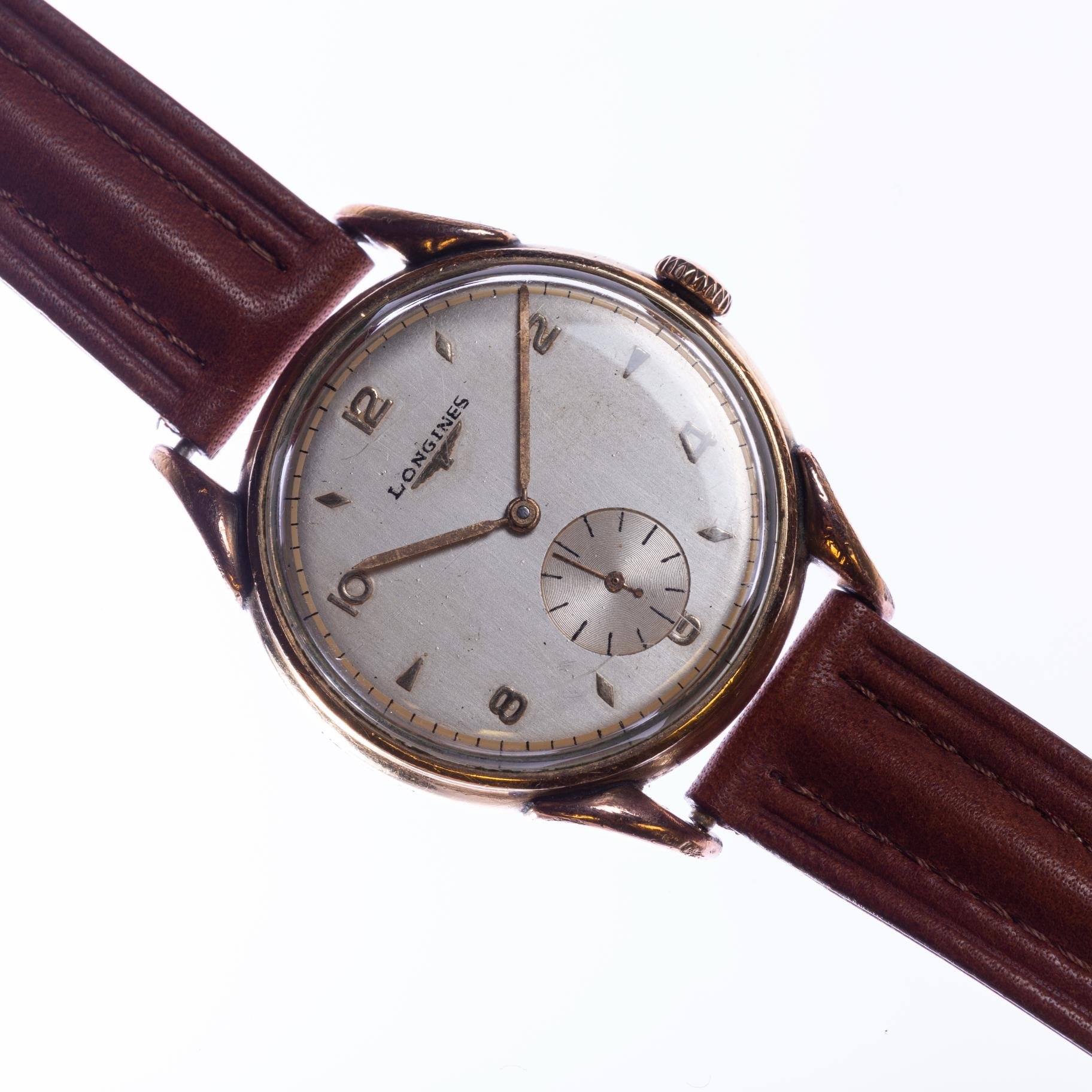Reloj pulsera para hombre marca Longines, a cuerda manual. Esfera plateada, con números, índex y agujas dorados, con segundero. Caja enchapada en oro amarillo, con tapa en acero inoxidable. Diámetro de caja 36 mm. Funcionando.