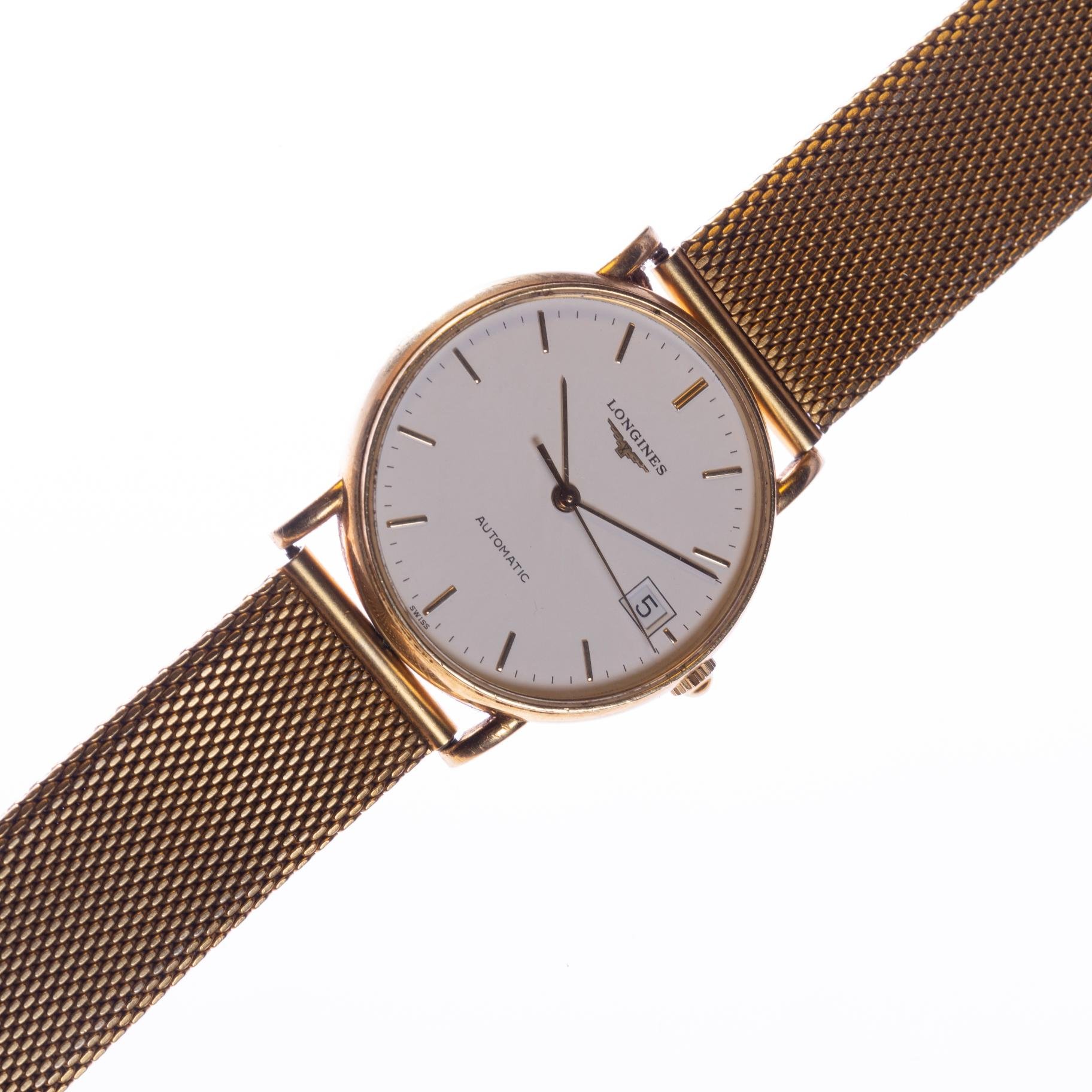 Reloj pulsera para hombre marca Longines, automático, con calendario. Esfera color blanco. Caja en oro 18 K amarillo. Diámetro de caja 33 mm. Malla en metal dorado. Funcionando.