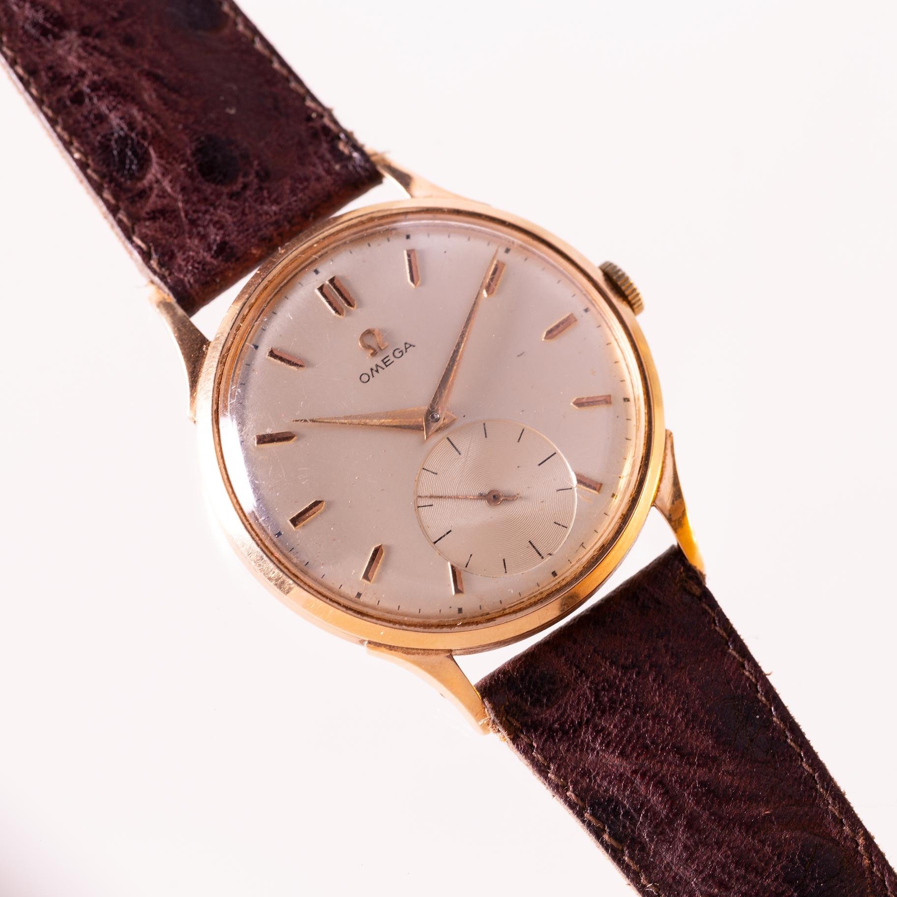 Reloj pulsera para hombre marca Omega, a cuerda manual. Esfera plateada, con agujas e índex en oro. Caja en oro 18 K amarillo. Diámetro de caja 37 mm. Funcionando.