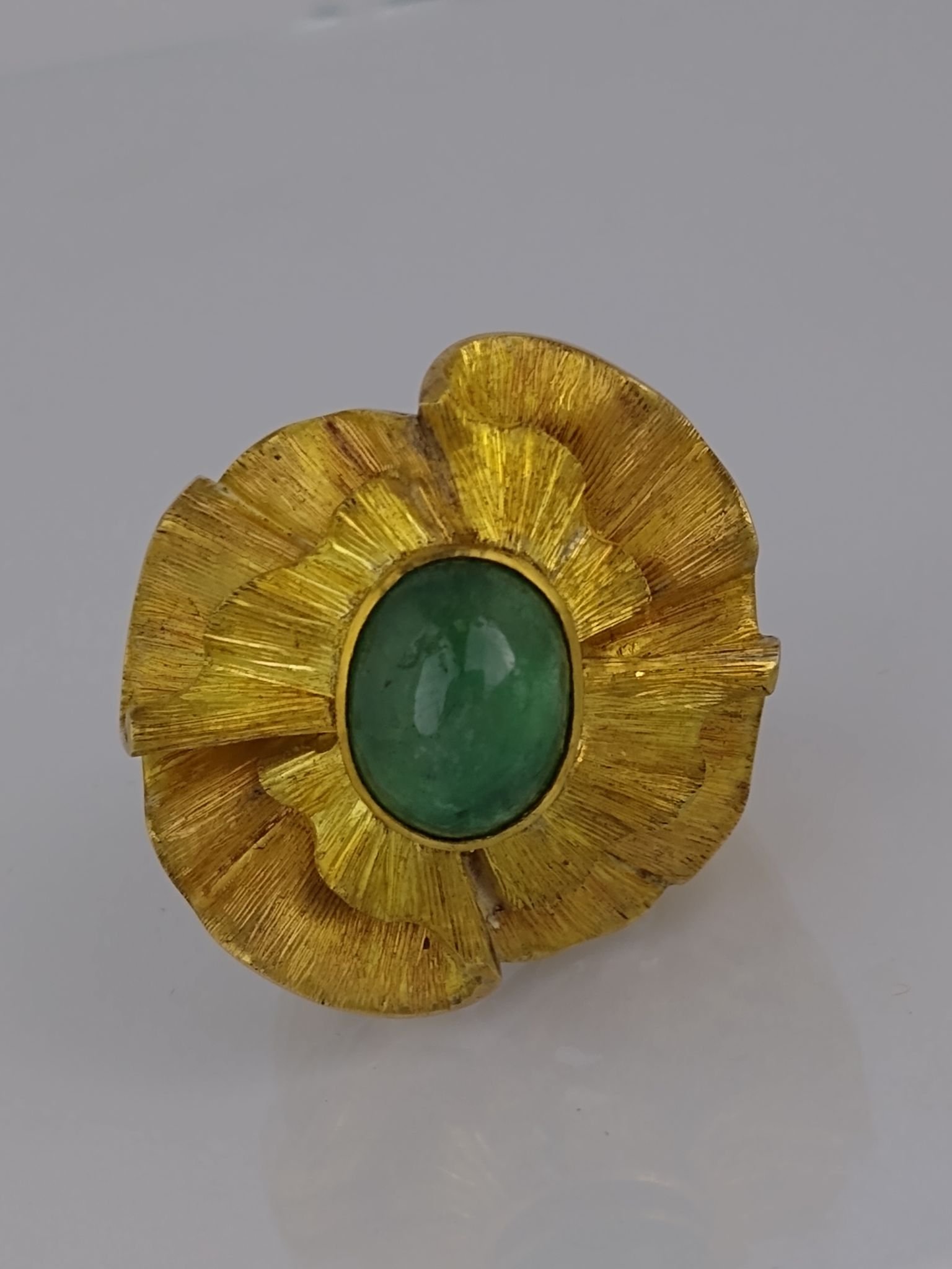 Anillo en oro 18 K amarillo esculturado en forma de flor con esmeralda central oval talla cabullón. Peso bruto 17 gr.