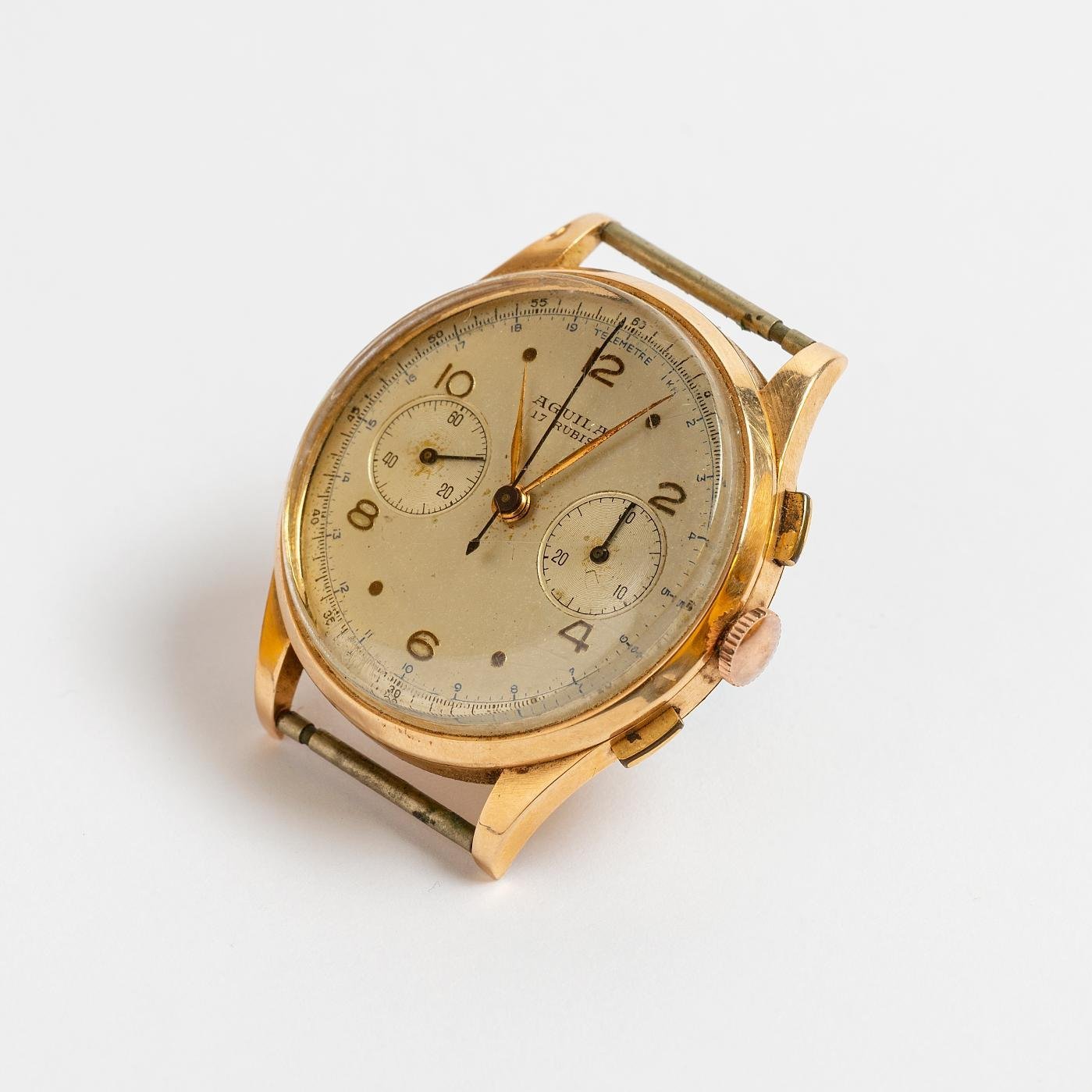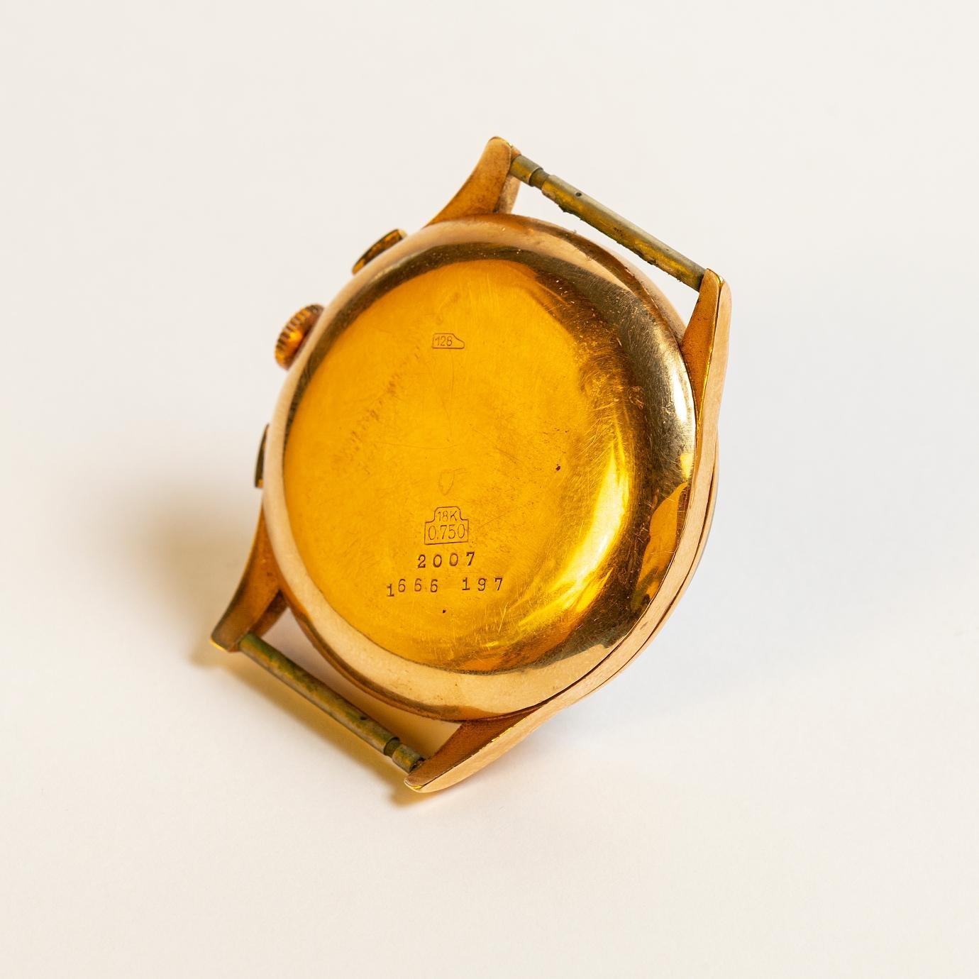 Reloj pulsera para hombre marca Águila, cronógrafo, a cuerda manual. Caja en oro 18 K amarillo. Funcionando.