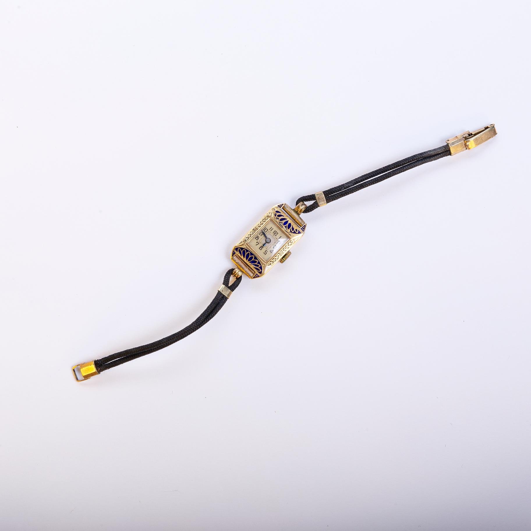 Reloj pulsera art decó para dama con caja en oro 18 K amarillo y esmalte azul y blanco, con cascaduras en esmalte. Malla en hilo trenzado. Medidas de caja 26 x 14 cm. No funciona.