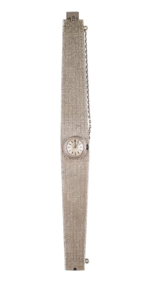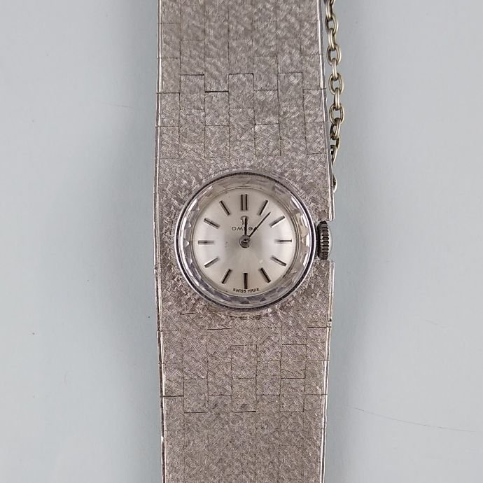 Reloj pulsera para dama marca Omega, a cuerda manual. Caja y malla en oro 18 K gris. Peso bruto 56 gr. Funcionando.