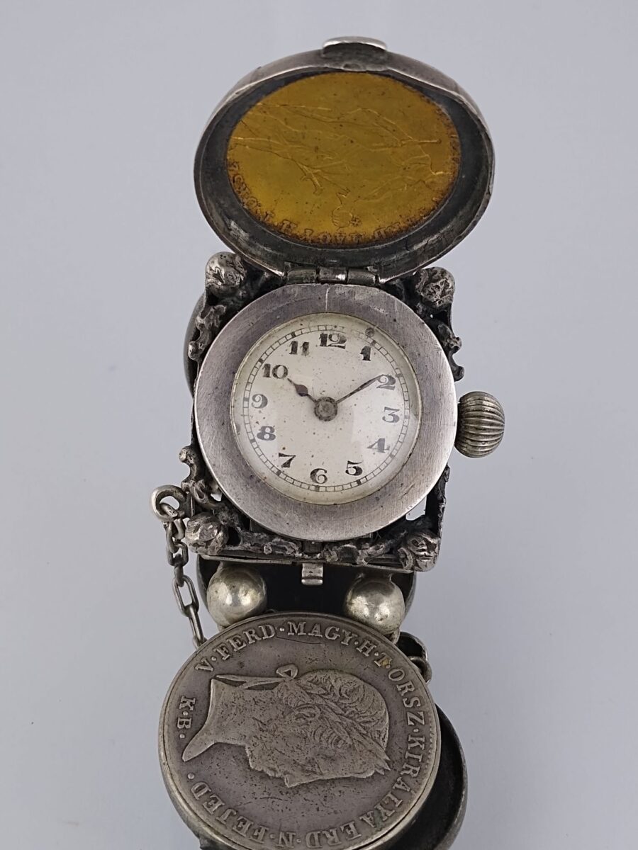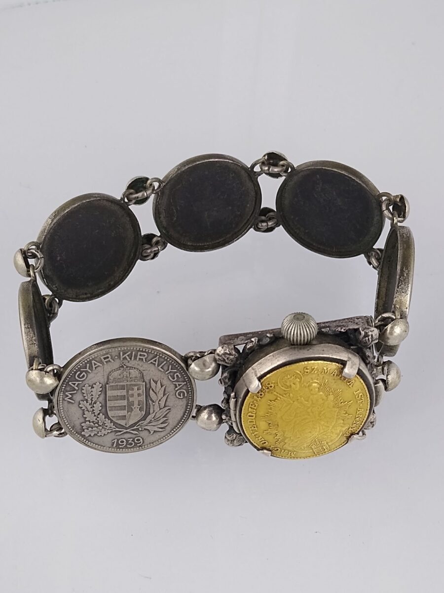 Reloj pulsera para dama. Caja y malla en plata. Malla decorada con seis monedas austrohúngaras. Tapa de caja decorada con medalla en oro fechada «1848». Peso bruto 50 gr. No funciona.