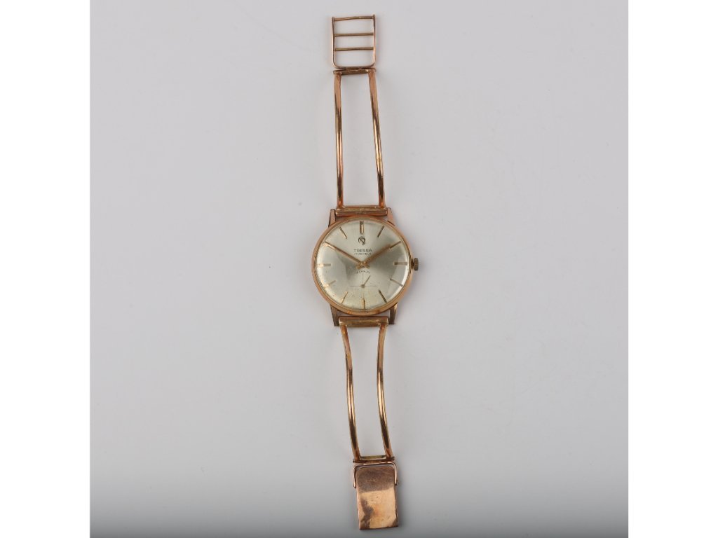 Reloj pulsera suizo para hombre marca Tressa modelo Incabloc, a cuerda manual. Esfera plateada con segundero. Caja y malla tipo araña en oro 18 K amarillo. Peso bruto 42 gr. Funcionando.