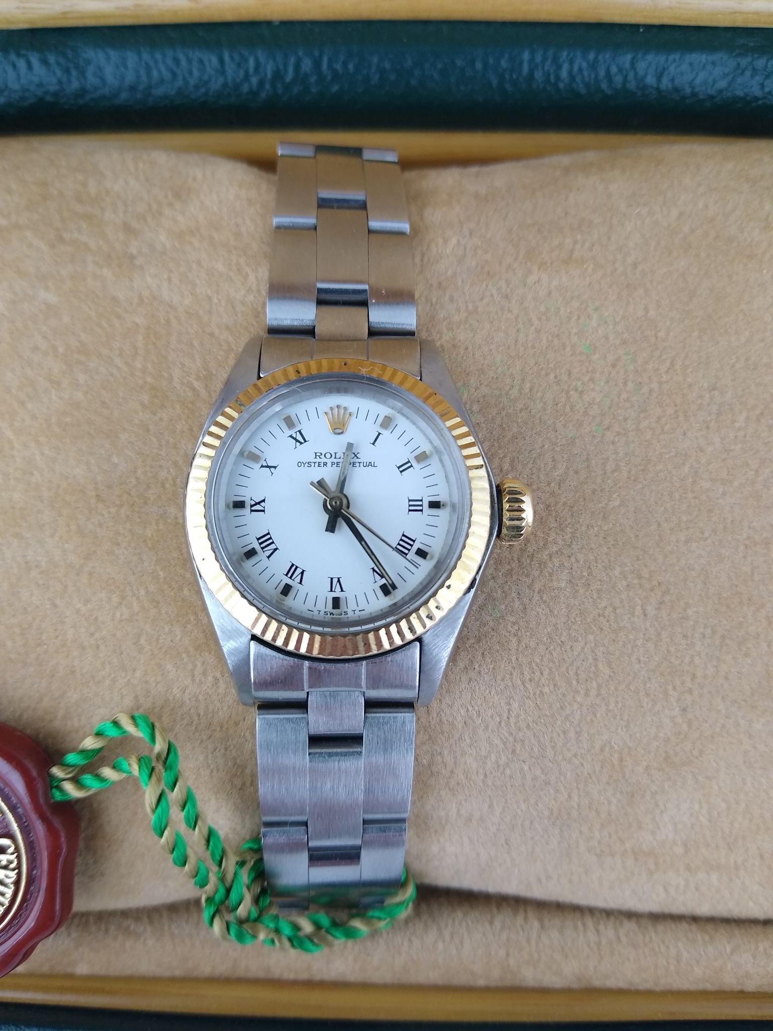 Reloj pulsera para dama marca Rolex modelo Oyster Perpetual, combinado. Caja y malla en acero. Aro y corona en oro. En caja original con certificados. Funcionando.