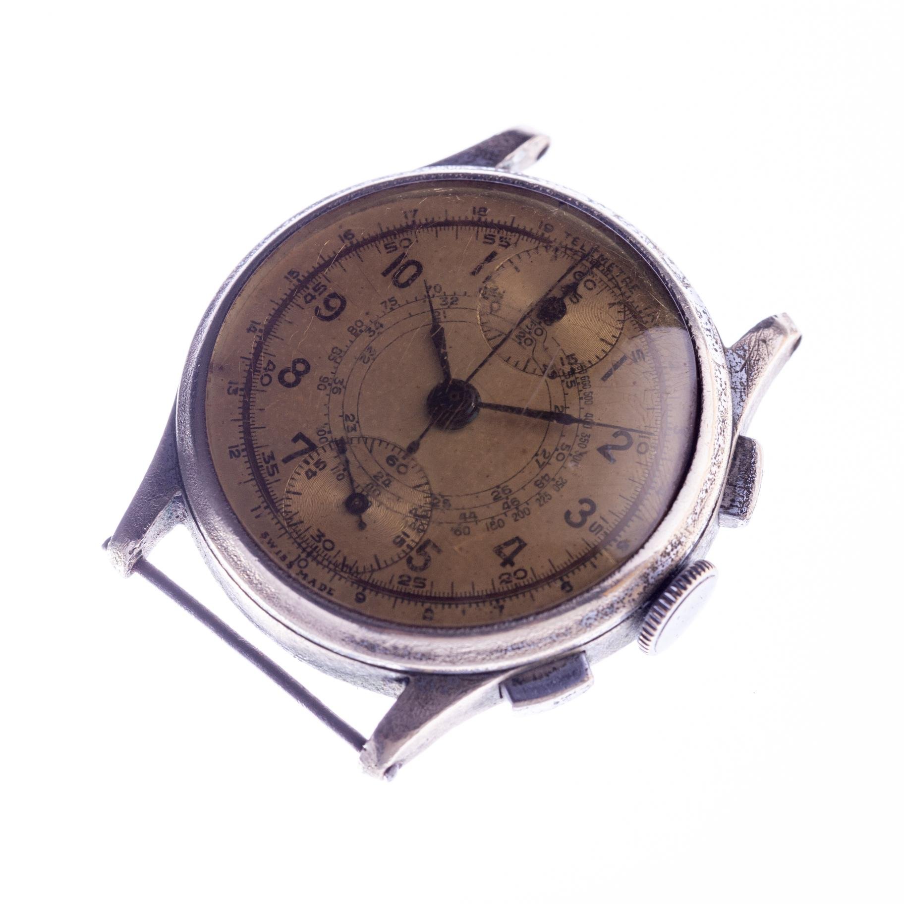 Reloj pulsera suizo con cronógrafo, para hombre. Caja en acero inoxidable. Diámetro de caja 32 mm. No funciona. Sin correa.