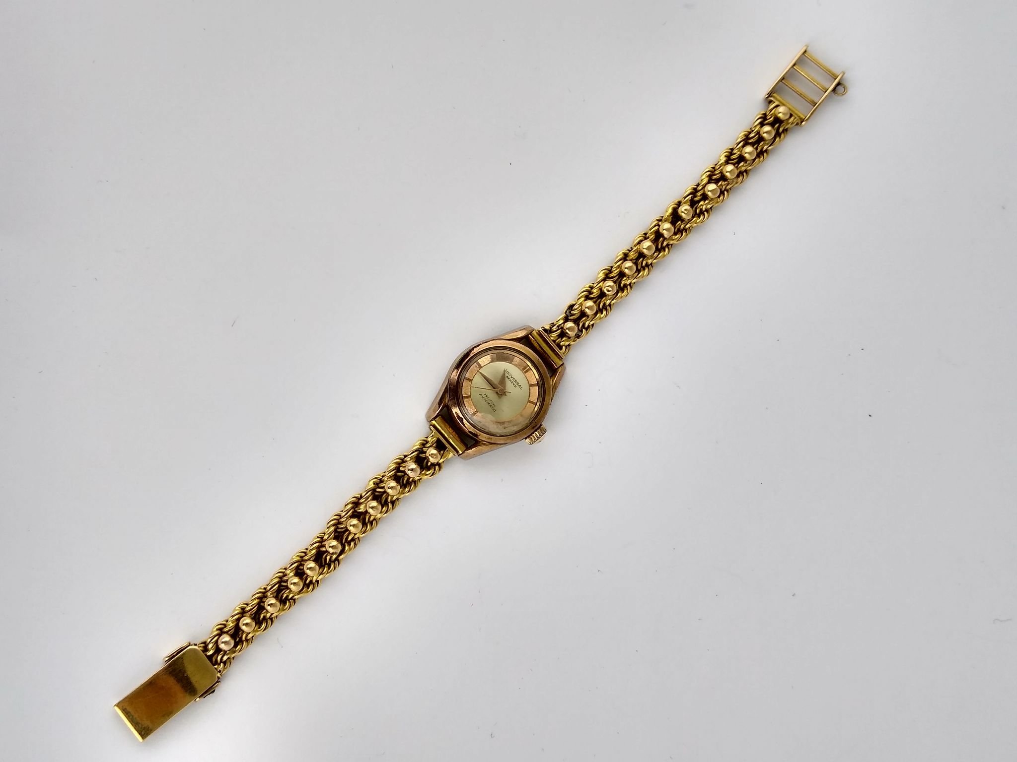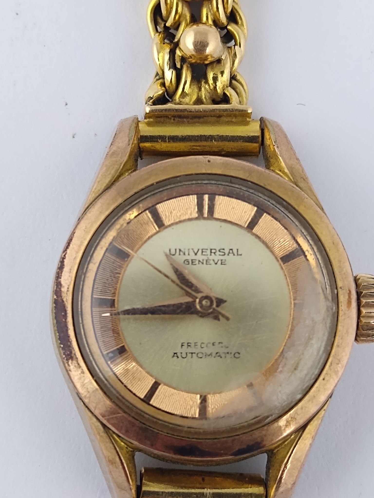Reloj pulsera para dama marca Universal, automático. Doble marca Freccero. Caja en oro 18 K amarillo, con tapa en acero inoxidable. Malla en oro 18 K amarillo, trenzado. Peso bruto 32 gr. No funciona.