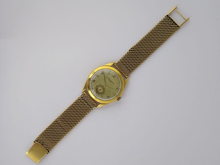 Reloj pulsera para hombre marca Vacheron Constantin, a cuerda manual. Esfera color gris, con pequeñas manchas de humedad y desgastes. Caja en oro 18 K amarillo de un diámetro de 40 mm. Malla suiza en oro 18 K amarillo trenzado, de un grosor de 18 mm. Funcionando.