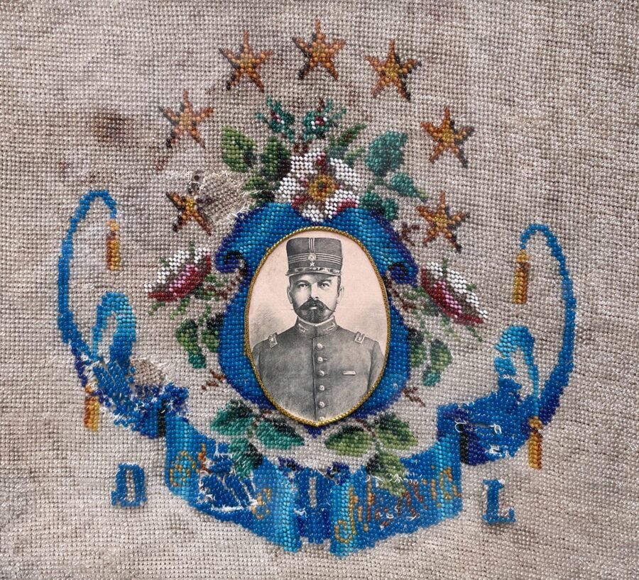 Retrato de Diego Lamas totalmente decorado «flores, estrellas y guirnaldas» e iniciales «D.L.» en mostacillas. 30 x 35 cm. Presentado en marco de madera tallada.