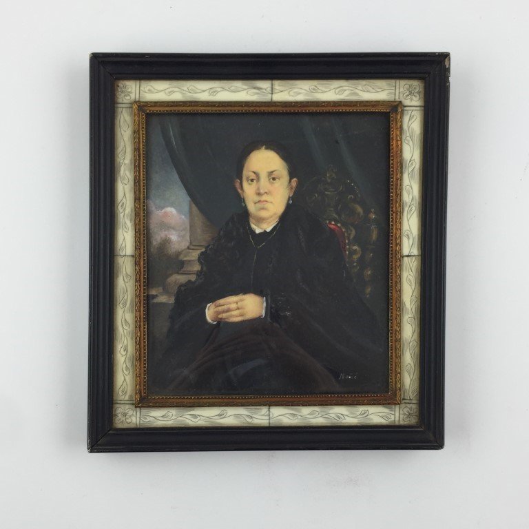 Par de retratos en miniatura. Óleo y acuarela sobre celuloide. «Don Julio Moreira» y «Sra. de Moreira.» Firmados «Mañé» abajo a la derecha. 14.5 x 12.5 cm.