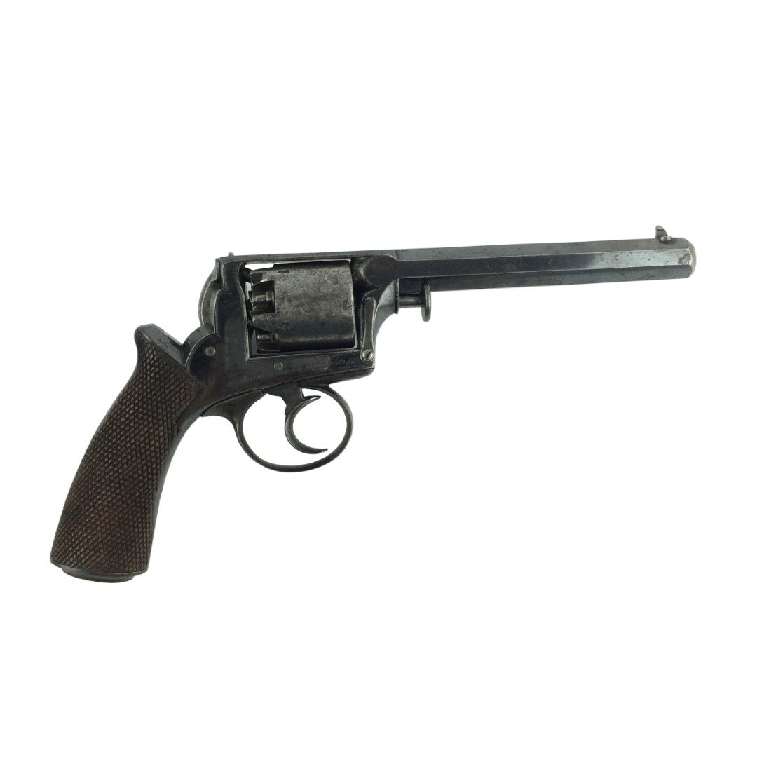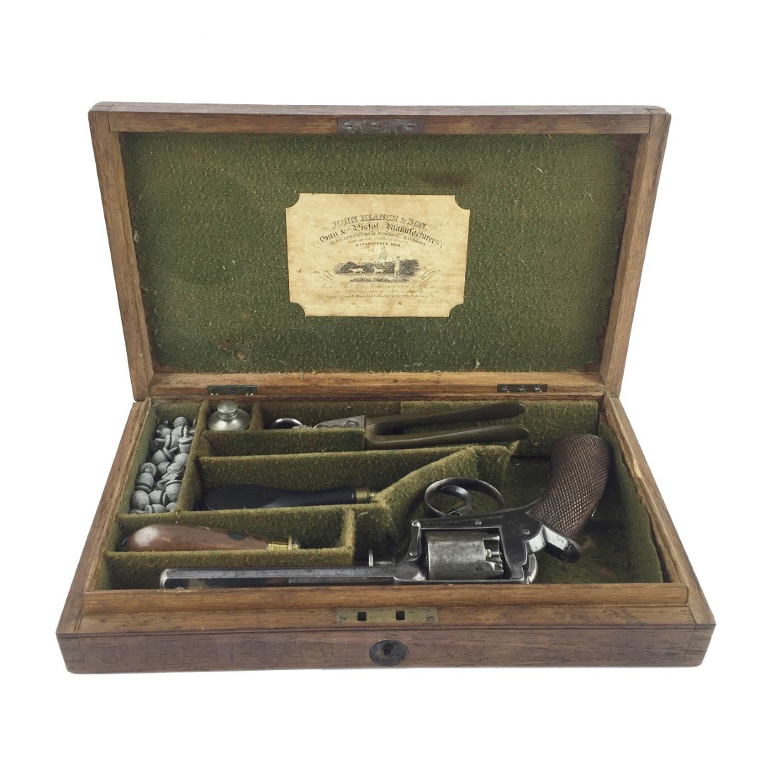 Revólver inglés. Fabricado por Blanch & Son. Carga lateral sistema de percusión patente Adams. Calibre 36. Tambor de cinco tiros. Con 80% de pavonado en marco. Caño octogonal. No. de serie 13950. Empuñadura en madera segrinada. En caja original en madera de roble, forrada en paño verde con averías y desgastes. Etiqueta de la marca en papel. Acompañada de cinco accesorios. Medidas de caja: 6 x 22 x 19 cm.