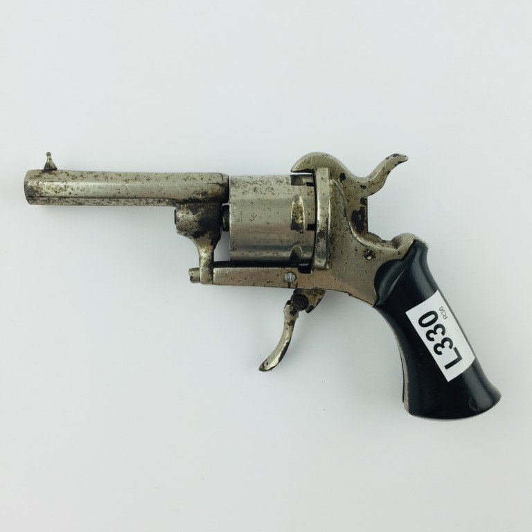 Revólver sistema Lefaucheux calibre 7 mm, con caño octogonal con restos de niquelado, gatillo retraíble y cachas en baquelita negra. Falta baqueta.
