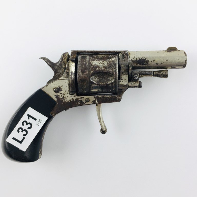 Revolver de bolsillo belga con tambor de cinco tiros, niquelado con faltantes, gatillo retraíble y cachas en baquelita negra.