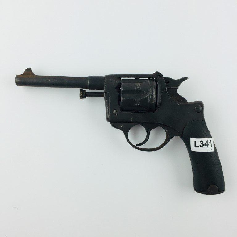 Revólver Level modelo 1892 calibre 8 mm, con cachas en madera desgastada.