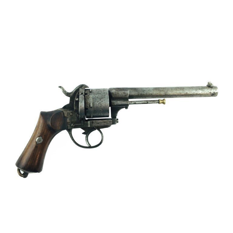 Revólver belga sistema Lefaucheux calibre 11 mm. Tambor de seis tiros, cincelado «arabescos». Cachas en madera lisa. Largo total 29 cm.