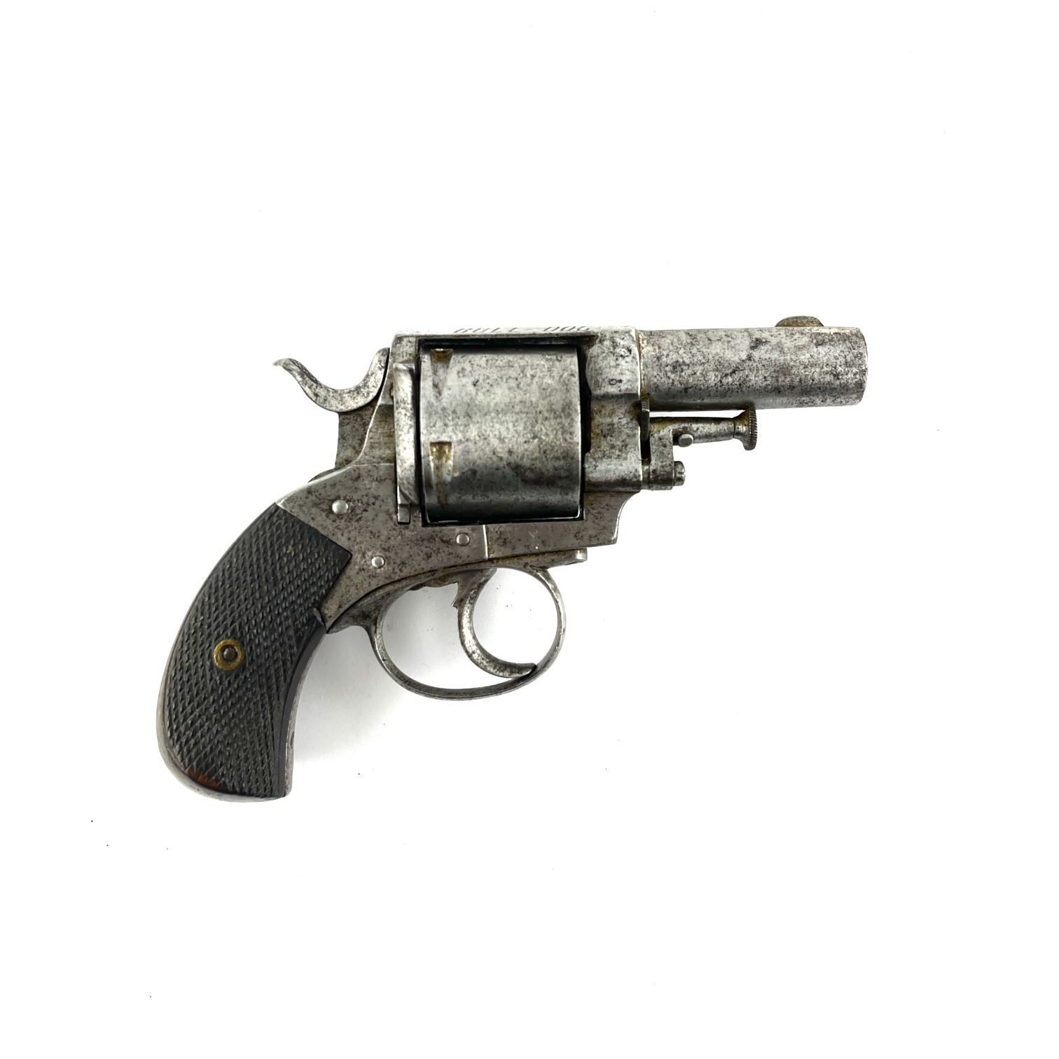 Revólver belga The British Bulldog calibre 450. Caño de dos pulgadas y media. Cachas en madera segrinada. No. de serie X1954. Funcionando.