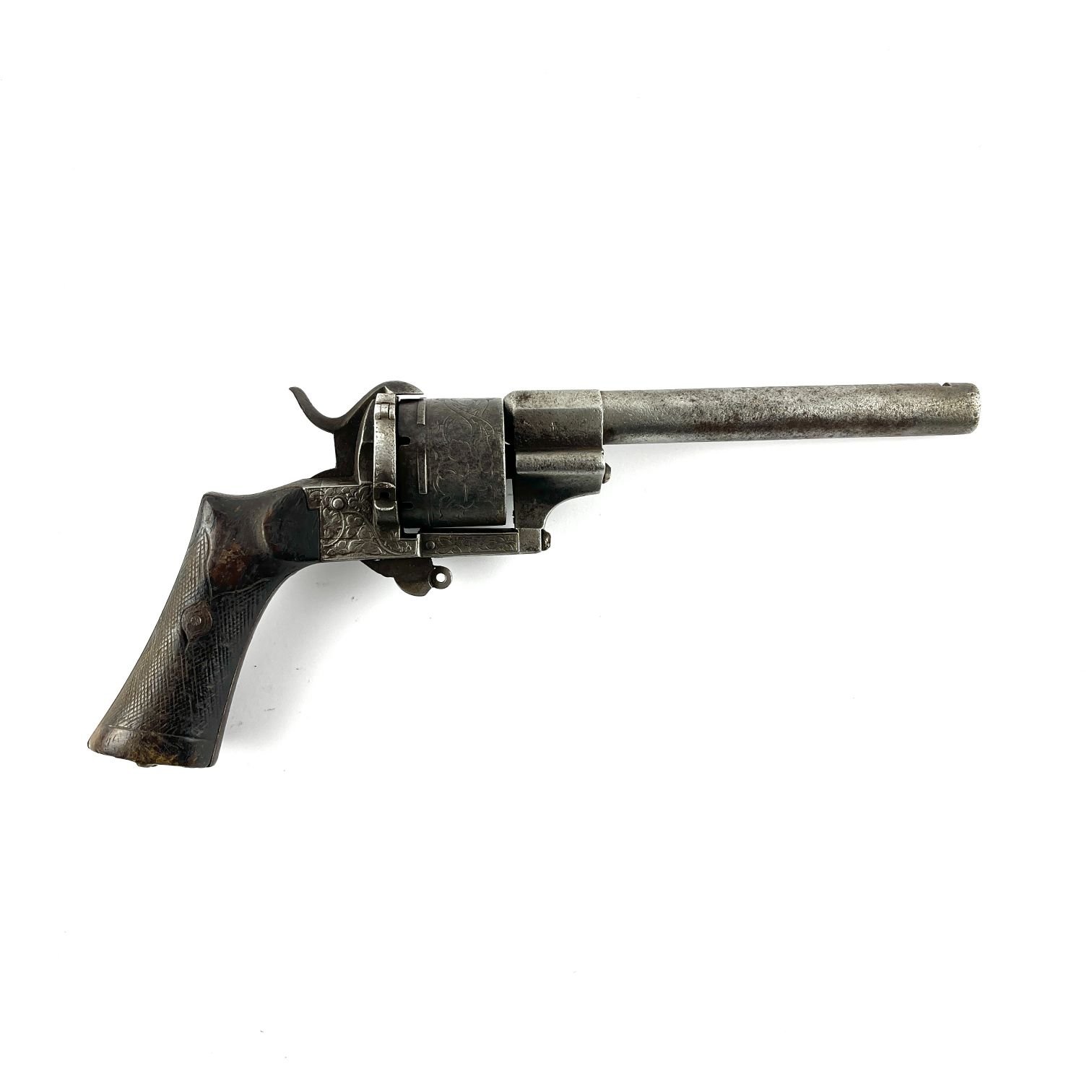 Revolver Lefaucheux calibre 11 mm. Tambor de 6 tiros cincelado «vides». Cachas en madera segrinada. Incompleto. Funcionando.