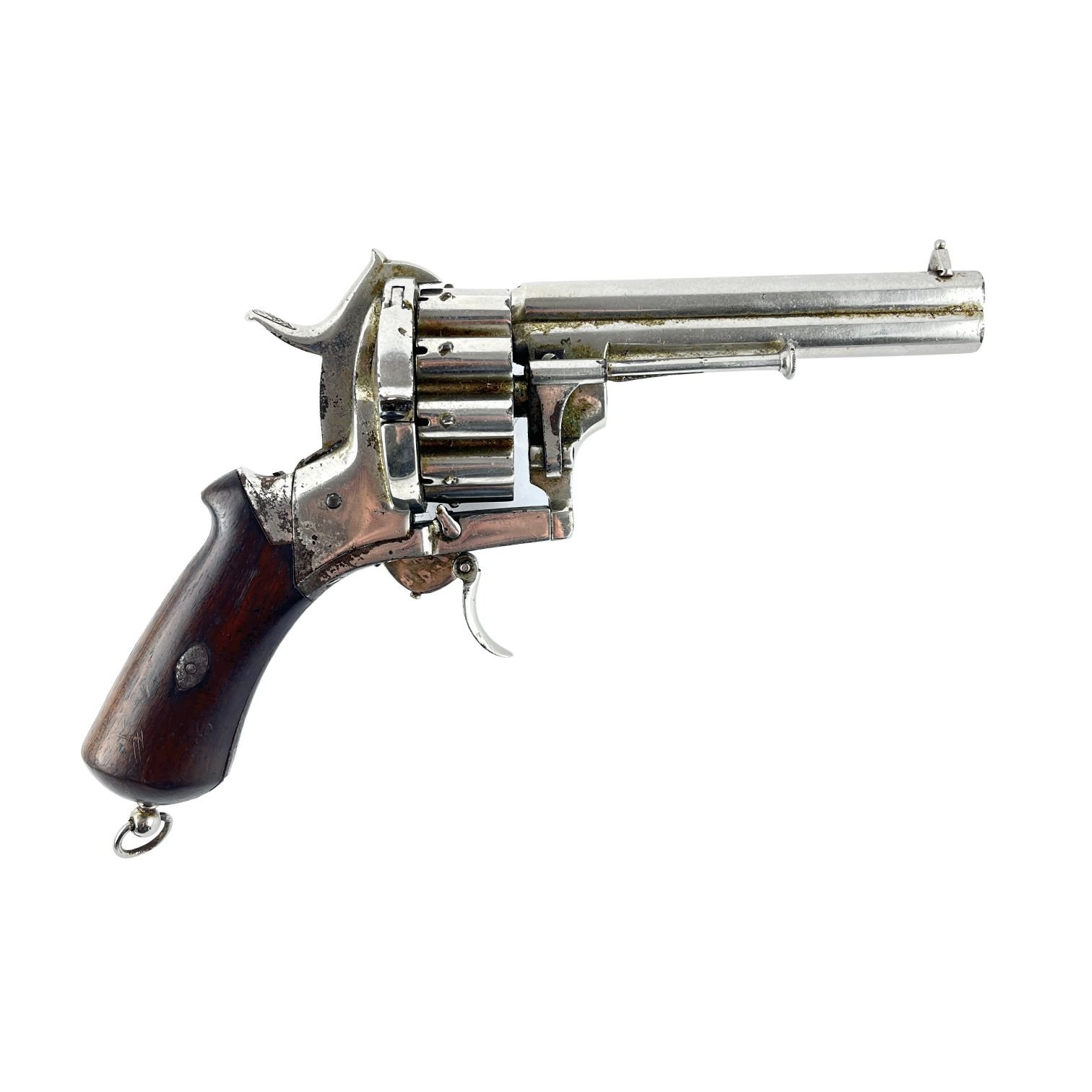 Revólver sistema Lefaucheux fabricado por Emile Lefaucheux. Doble caño. Doble tambor de veinte tiros. Niquelado al 90%. Cachas en madera lisa. Caño de cinco pulgadas. Gatillo retraíble, con desgaste en acción. No. de serie 1220. Funcionando.