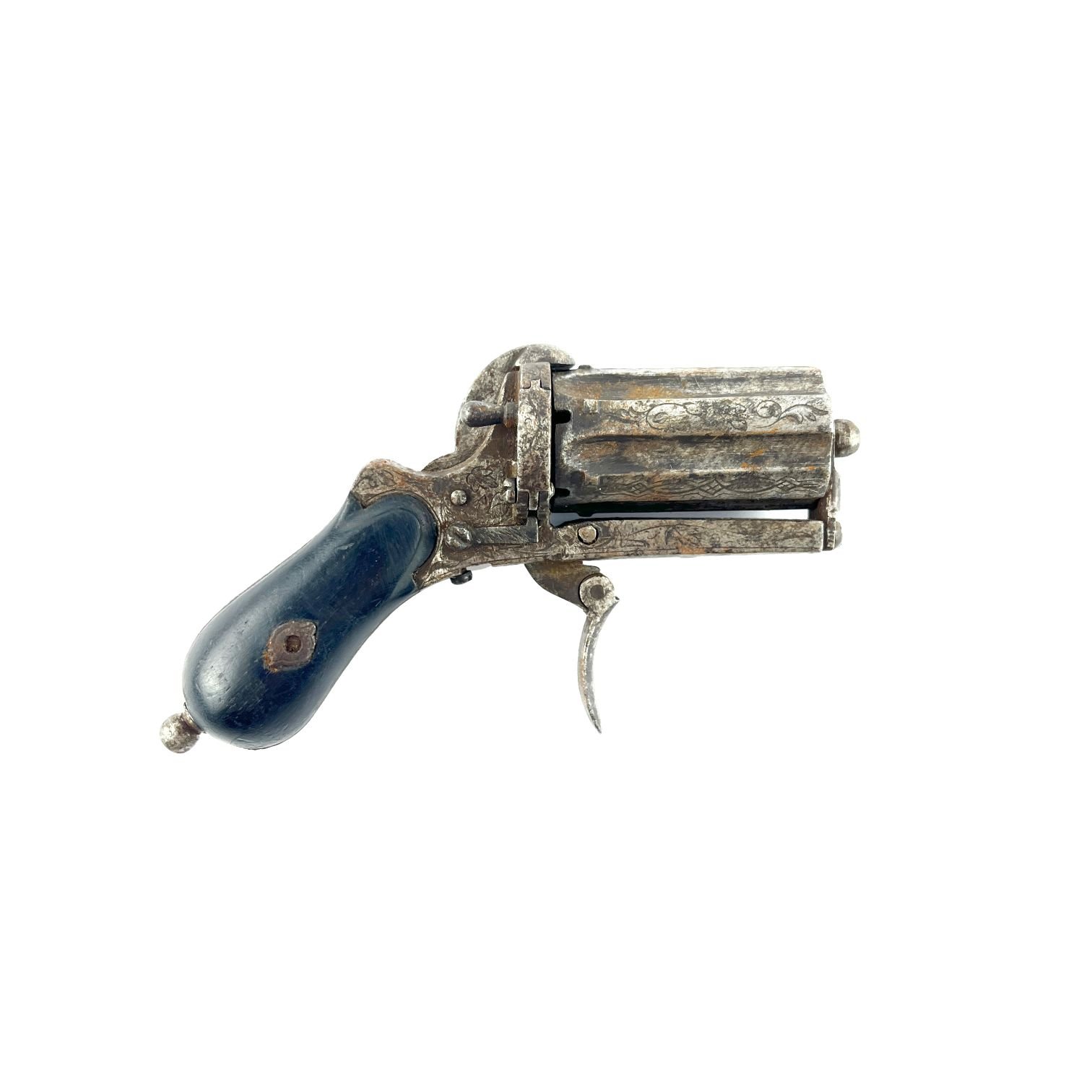 Revólver belga Pepperbox sistema Lefaucheaux calibre 5 mm. Tambor de seis tiros cincelado «hojas». Gatillo retraíble, no monta. Cachas en ébano liso. Largo total 11 cm.