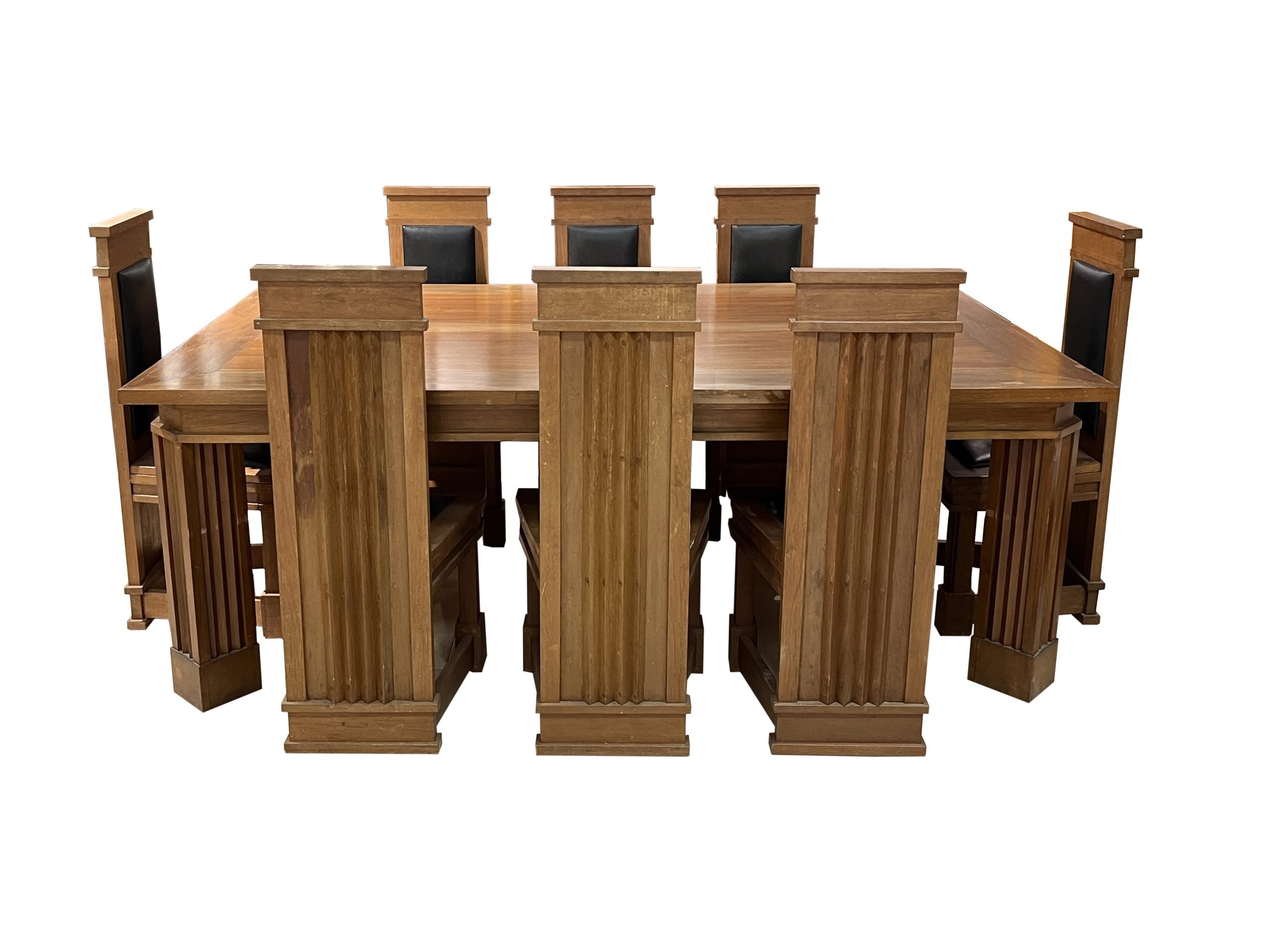 Juego de comedor o directorio en madera dura, con diseño geométrico, compuesto por mesa rectangular de cuatro patas y ocho sillas con asientos y respaldos tapizados en cuero negro