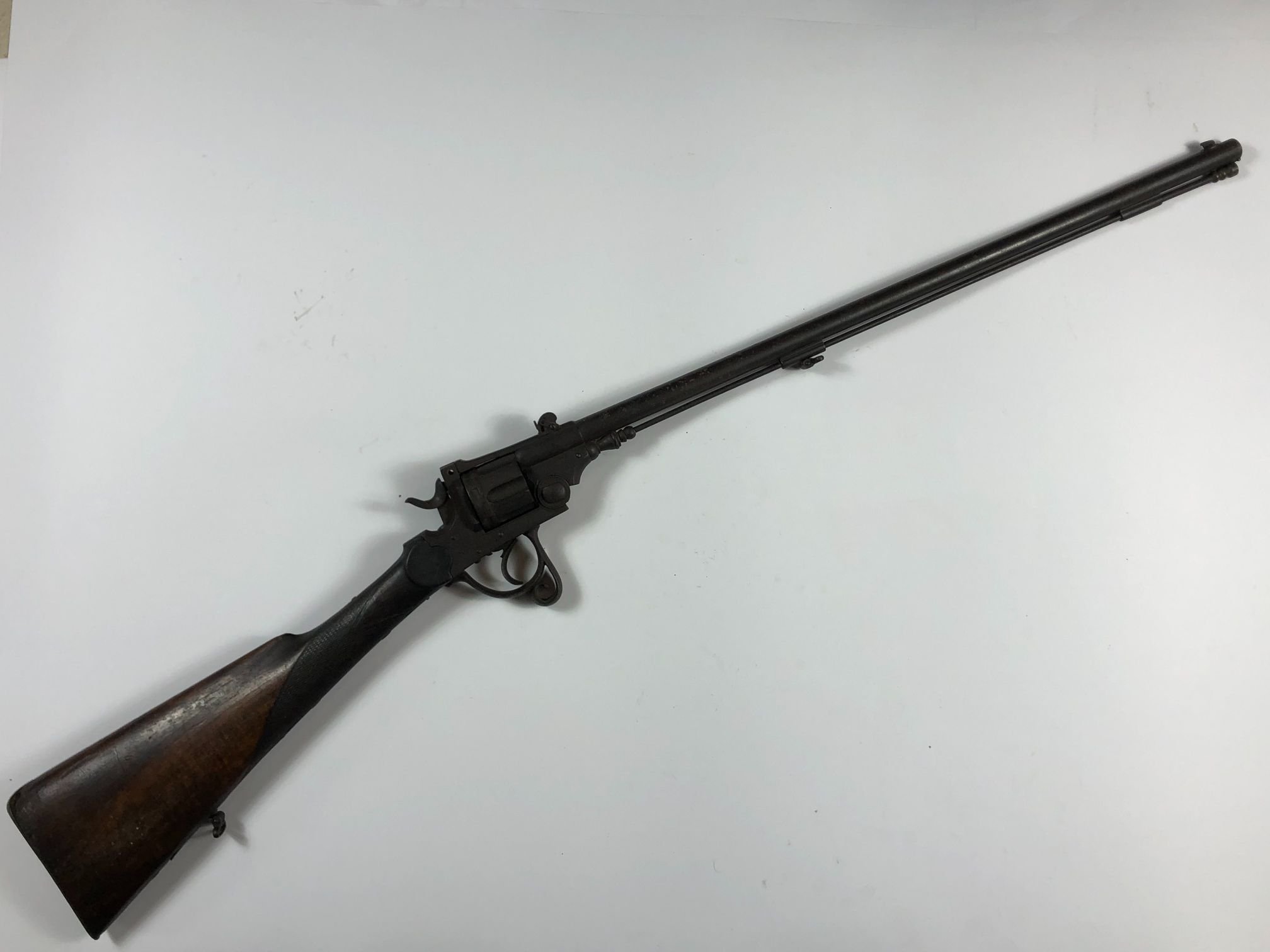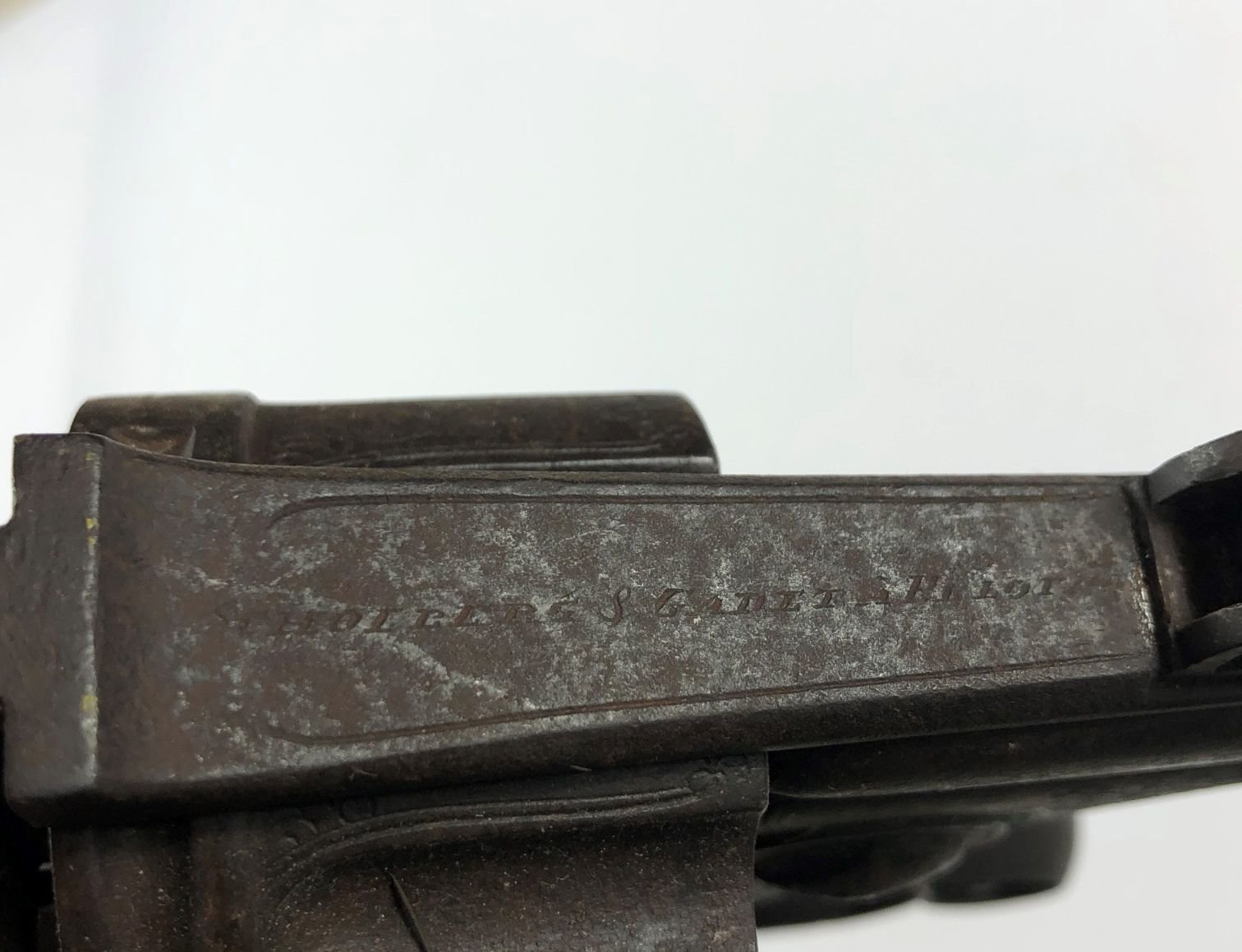 Rifle revólver belga seis tiros. Cincelado «hojas», con culata en madera segrinada. Vendido por Scholberg & Gadet, Liege. Importado por Scholberg y Gadet, Pelotas.