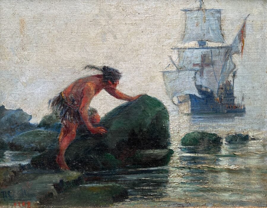 ROBERTO CASTELLANOS (1871-1942). Óleo sobre tela. «Encuentro de dos mundos.» Firmado abajo a la izquierda. 30 x 38 cm.