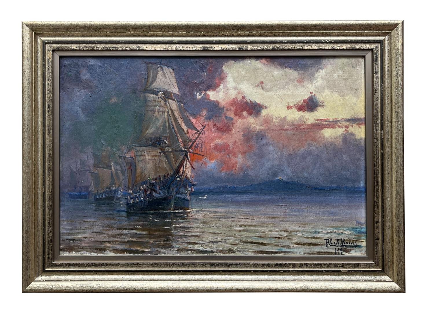 ROBERTO CASTELLANOS (escuela uruguaya, 1871-1942). Óleo sobre tela. «Corsarios en la bahía de Montevideo.» Firmado y fechado «1926». abajo a la derecha. 32 x 49 cm.