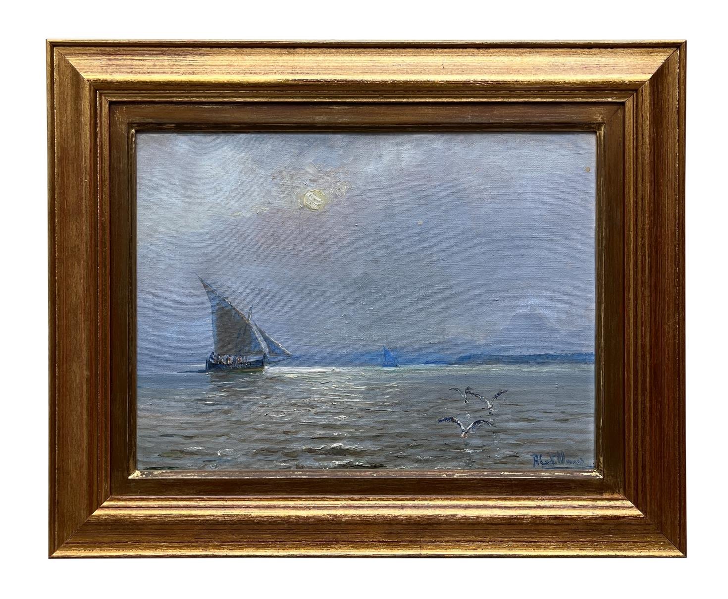 ROBERTO CASTELLANOS (escuela uruguaya, 1871-1942). Óleo sobre tela pegada en tabla. «Marina.» Firmado abajo a la derecha. 27 x 37 cm.