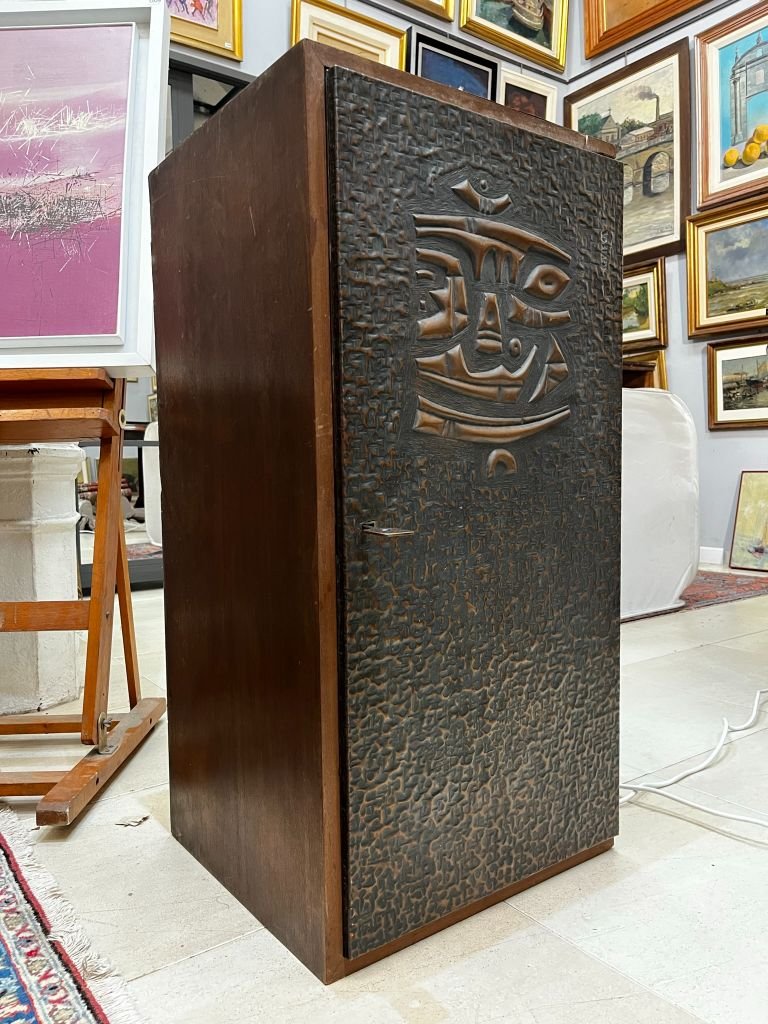 Mueble bar en madera enchapada en caoba, con tapa de volcar forrada en chapa de cobre repujada y cincelada «formas geométricas»