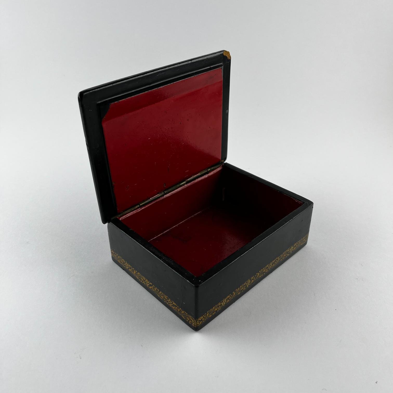 Caja rusa de sobremesa en papel maché laqueado. Tapa pintada a mano «dama orando con cabra» con guarda dorada. Firmada. 4.5 x 13.5 x 10 cm.