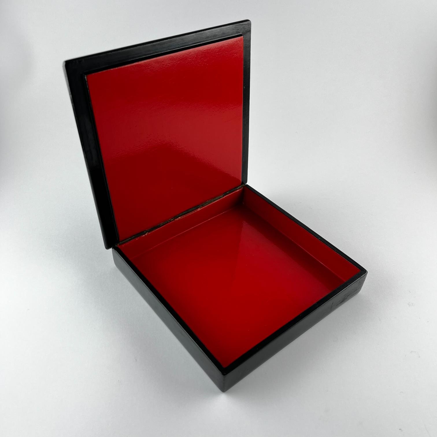 Caja rusa de sobremesa en papel maché laqueado. Tapa pintada a mano «flores» con detalles de oro. Firmada. 4 x 19 x 19 cm.