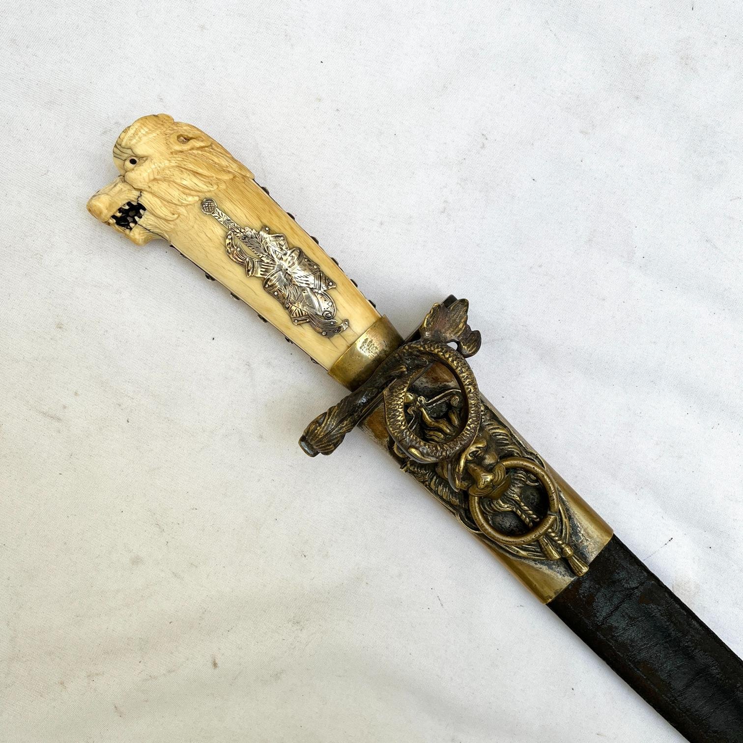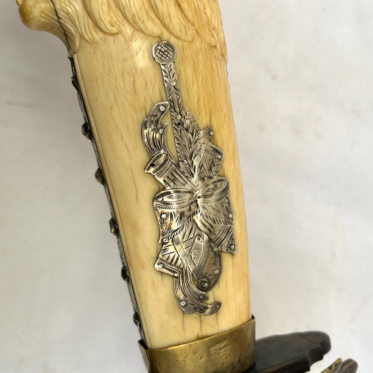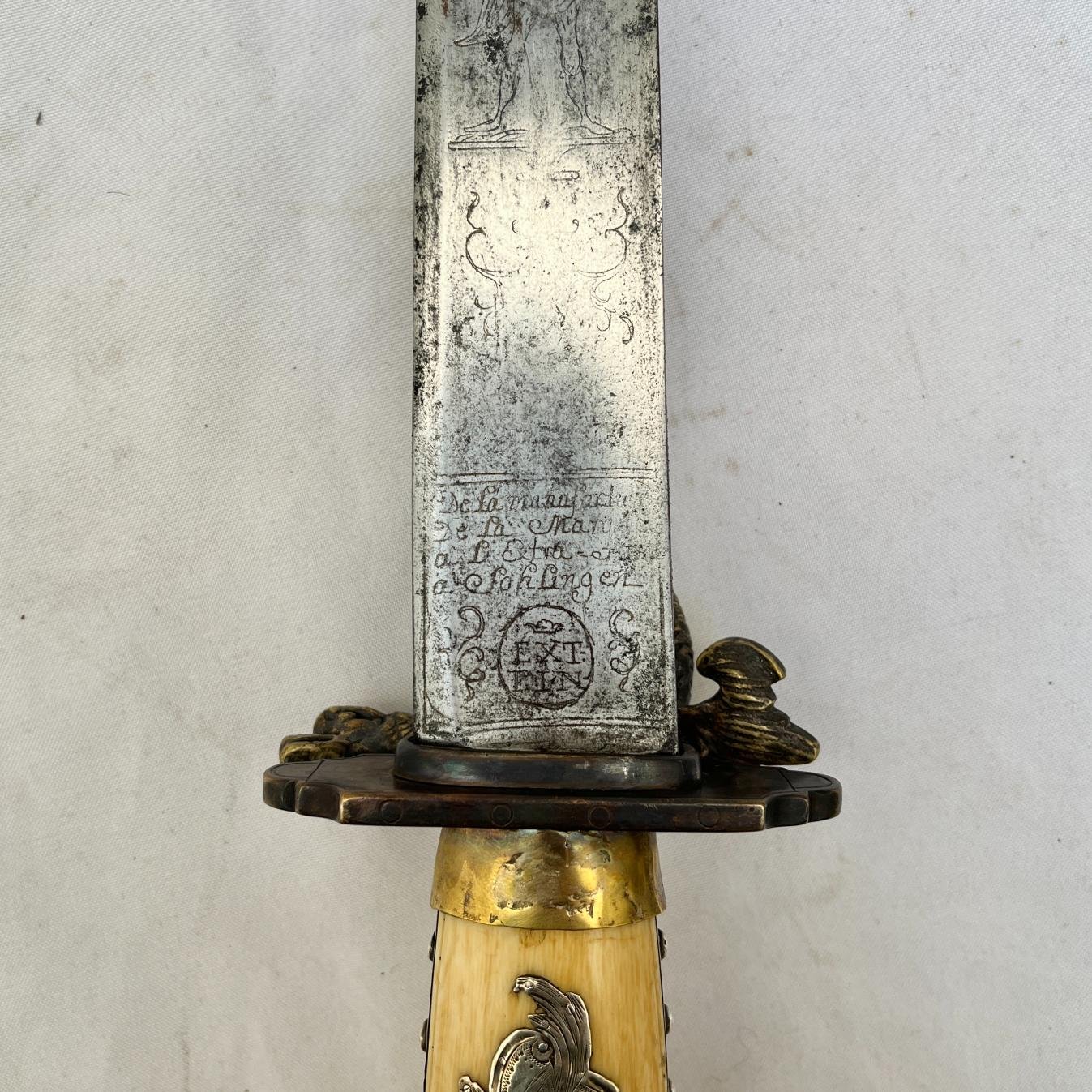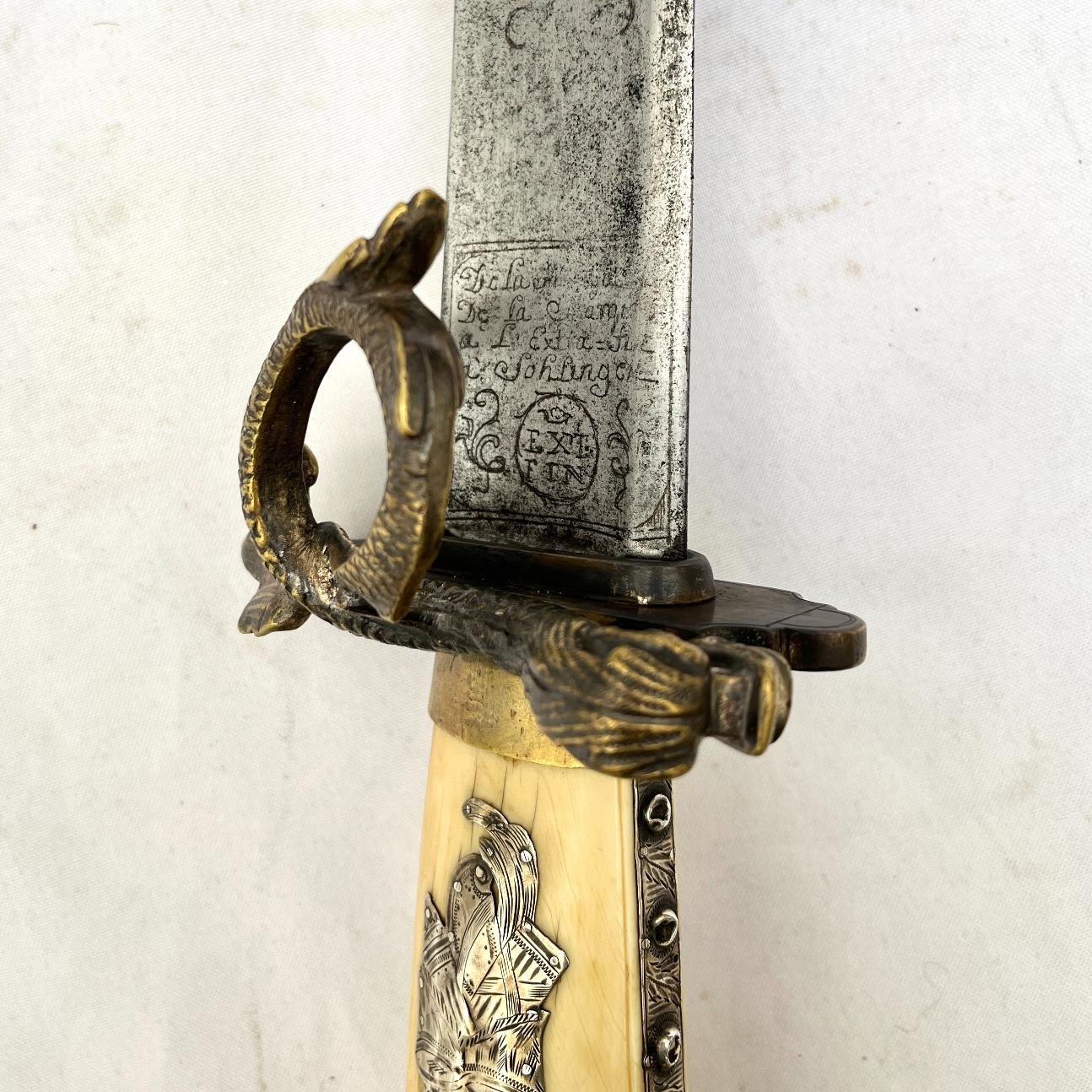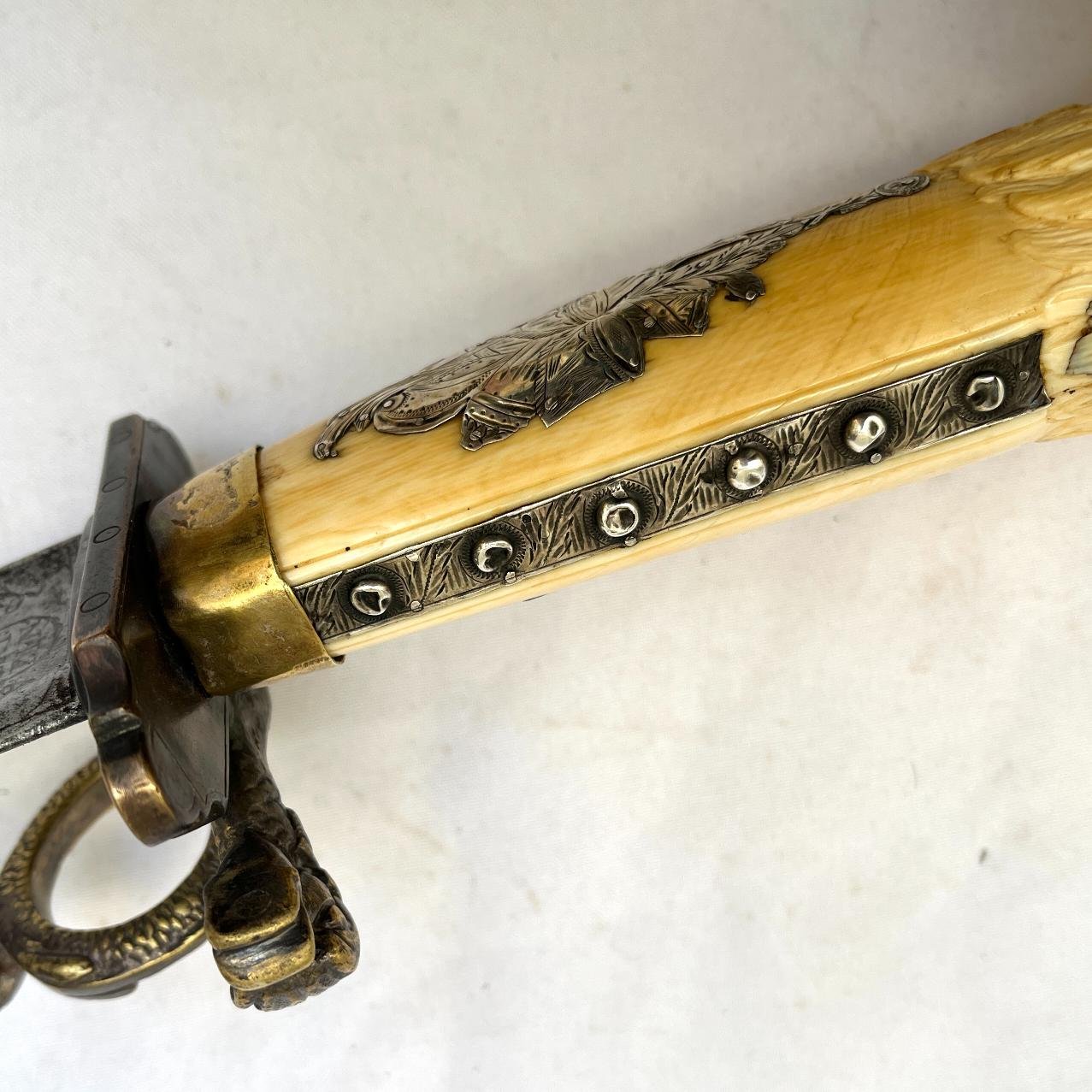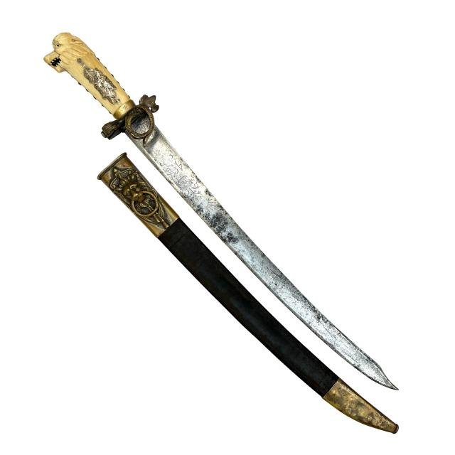 Sable alemán de abordaje c. 1800. Hoja realizada en Solingen, cincelada «personaje y flores», con iniciales «J.S.». Cabo en marfil esculturado «cabeza de felino», decorado «motivos militares» en incrustaciones de plata. Gavilán en bronce esculturado «delfín mitológico». Vaina picasa en cuero negro, con bocavaina y puntera en bronce. Argolla de bocavaina en bronce esculturado «cabeza de león». Largo total 72 cm.
