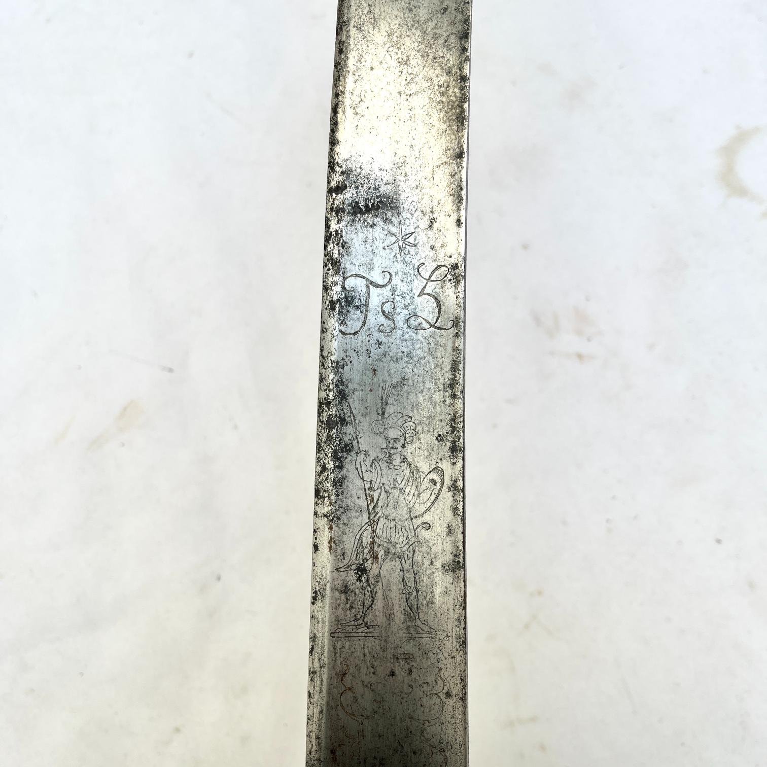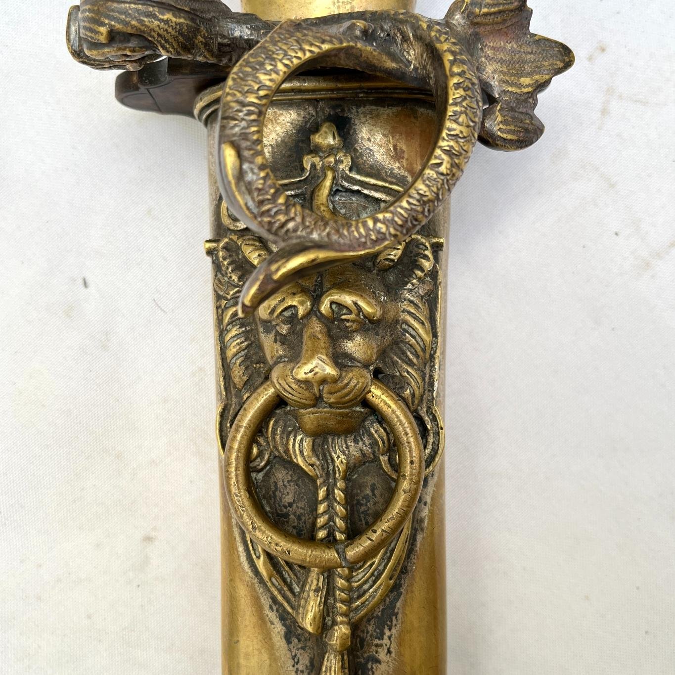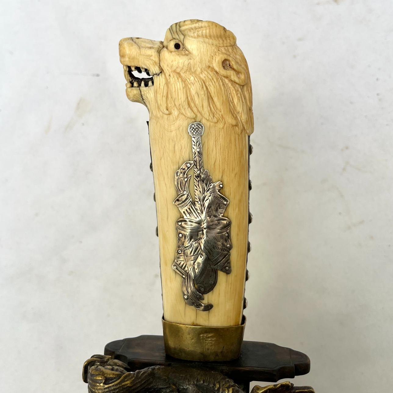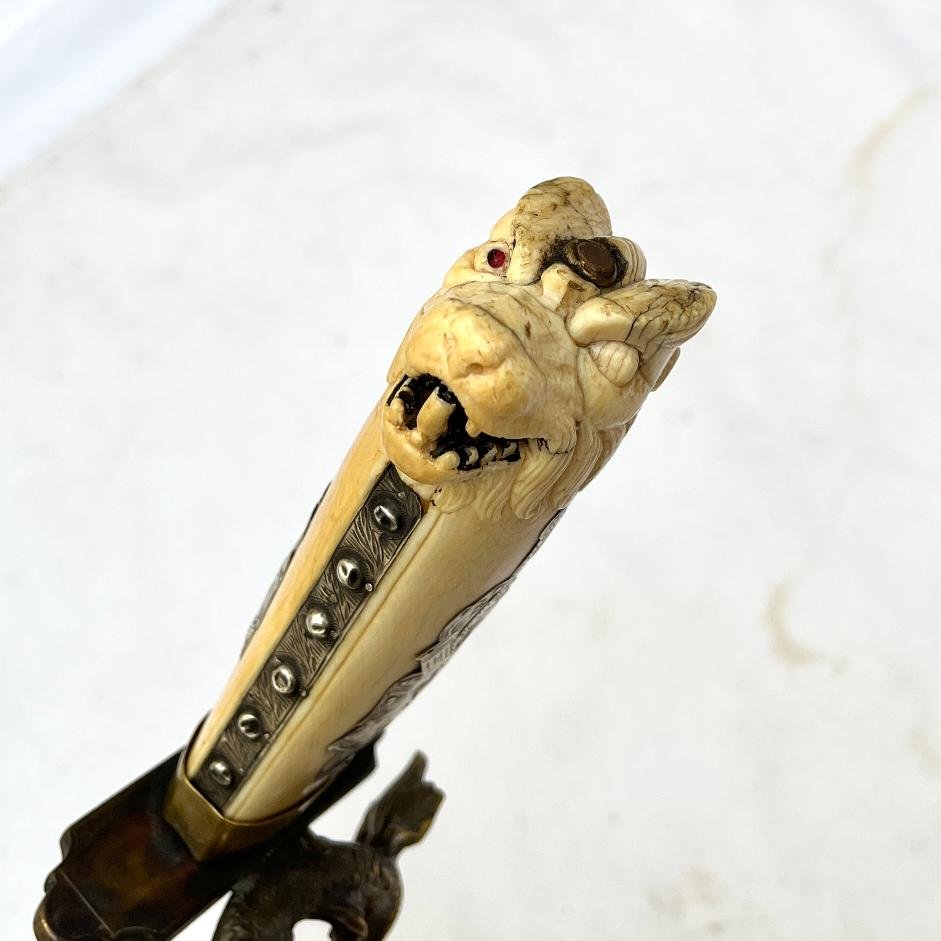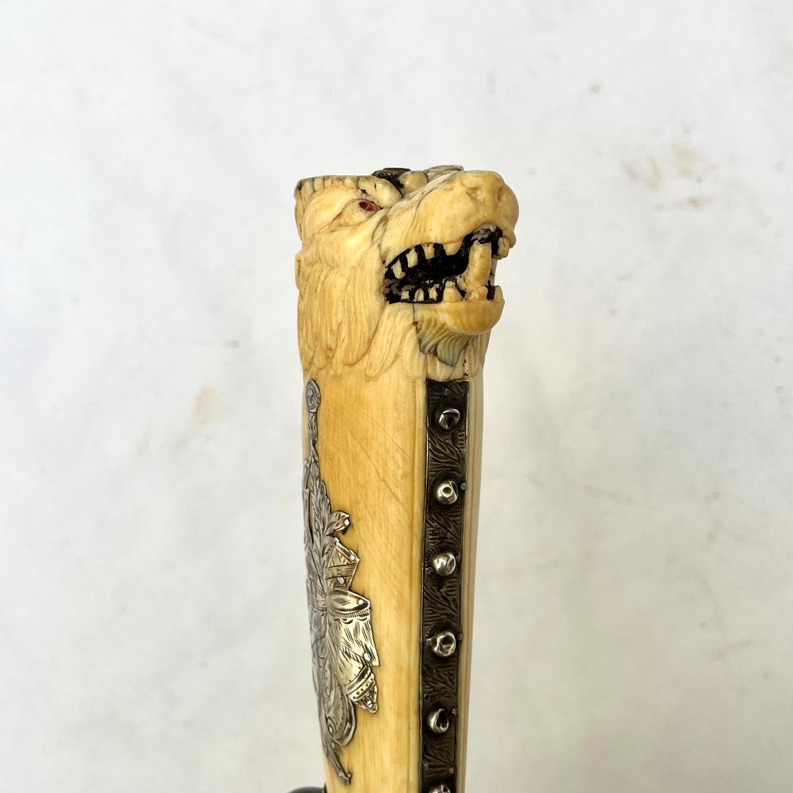 Sable alemán de abordaje c. 1800. Hoja realizada en Solingen, cincelada «personaje y flores», con iniciales «J.S.». Cabo en marfil esculturado «cabeza de felino», decorado «motivos militares» en incrustaciones de plata. Gavilán en bronce esculturado «delfín mitológico». Vaina picasa en cuero negro, con bocavaina y puntera en bronce. Argolla de bocavaina en bronce esculturado «cabeza de león». Largo total 72 cm.
