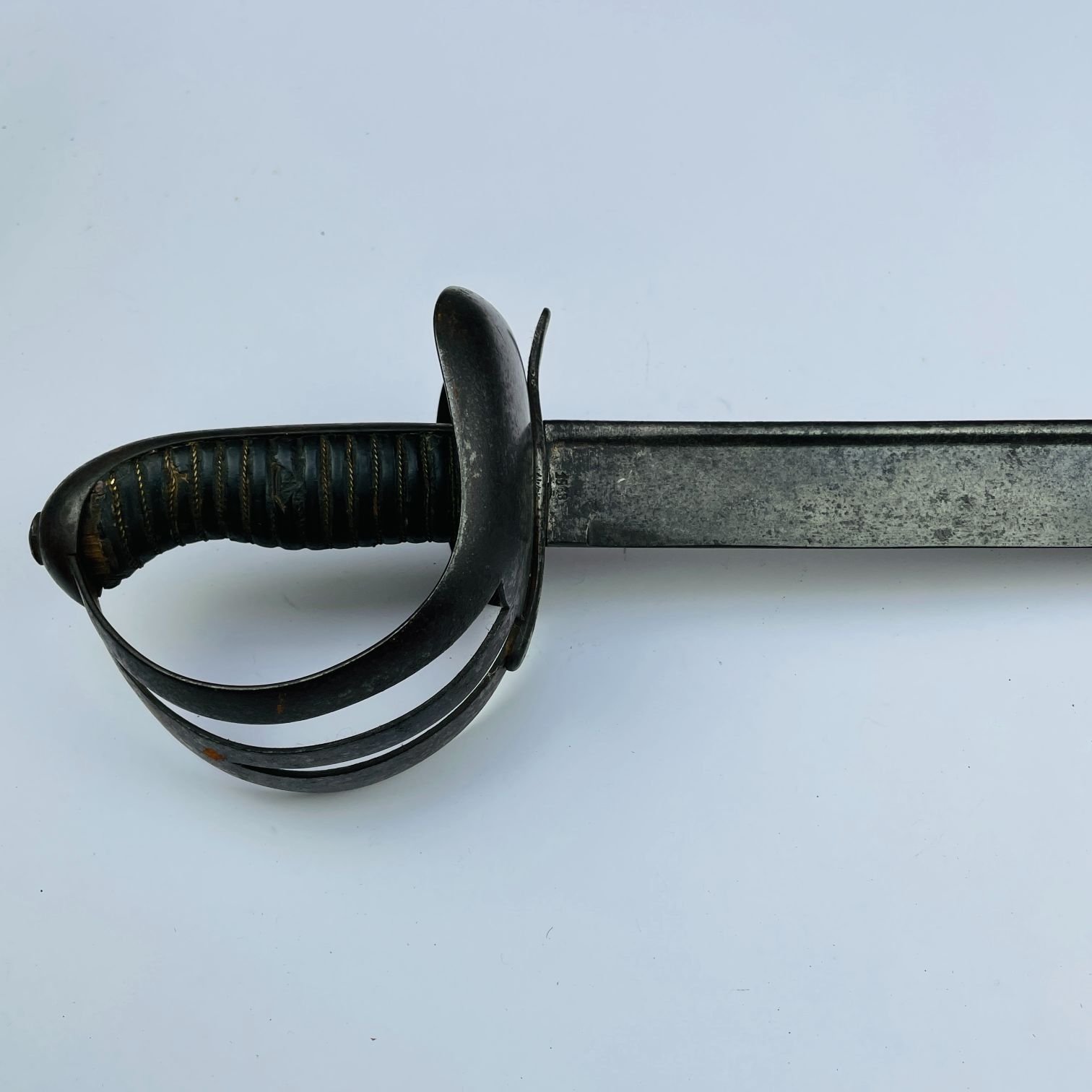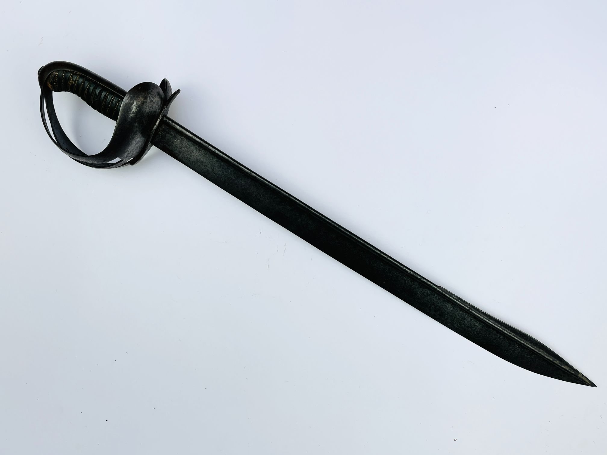 Sable alemán de abordaje. Guardamano de tres ramales. Empuñadura forrada en cuero, con filigrana en bronce. Hoja con marcajes no identificados. Largo total 76 cm. Sin vaina.
