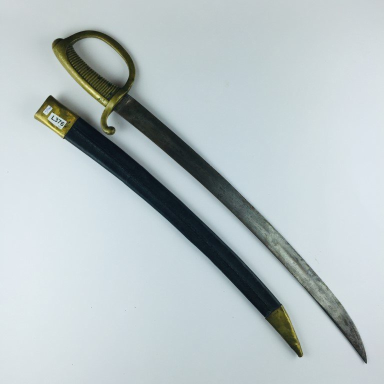 Sable alemán tipo briquet fabricado en Reimscheid. Cabo en bronce y vaina picasa en cuero negro con bocavaina y puntera en bronce.