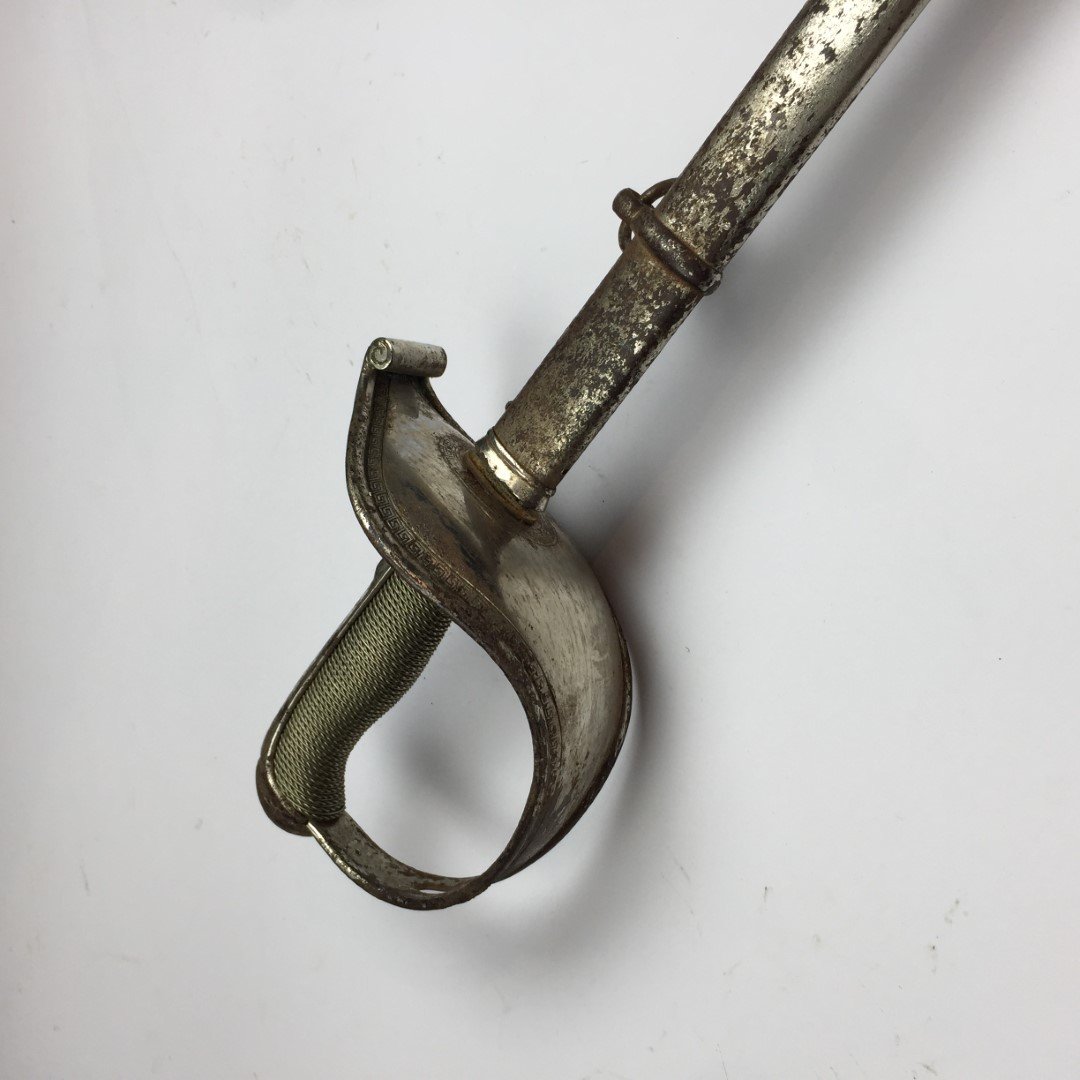 Sable argentino fabricado por Kirschbaum. Hoja con inscripción «República Argentina». Cabo en filigrana plateada. Guardamano en metal niquelada, decorado “guarda griega”. Vaina de dos anillas en metal con restos de niquelado. Tipo de arma utilizada durante la Campaña del Desierto c. 1870.