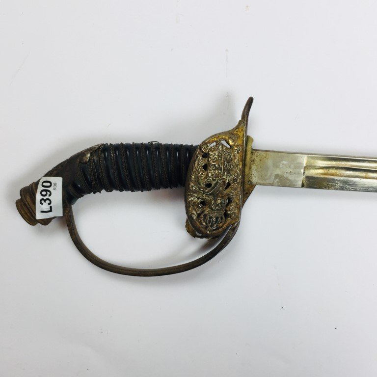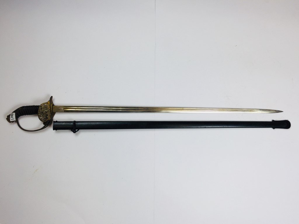 Sable austríaco, siglo XIX. Hoja recta, empuñadura forrada en baquelita con filigrana de bronce, guardamano en hierro con monograma «KR» coronado y cartela retraíble calada y cincelada «blasón con yelmo y corona» con restos de dorado y vaina en acero pintada en negro, con una anilla. Largo total 97 cm.