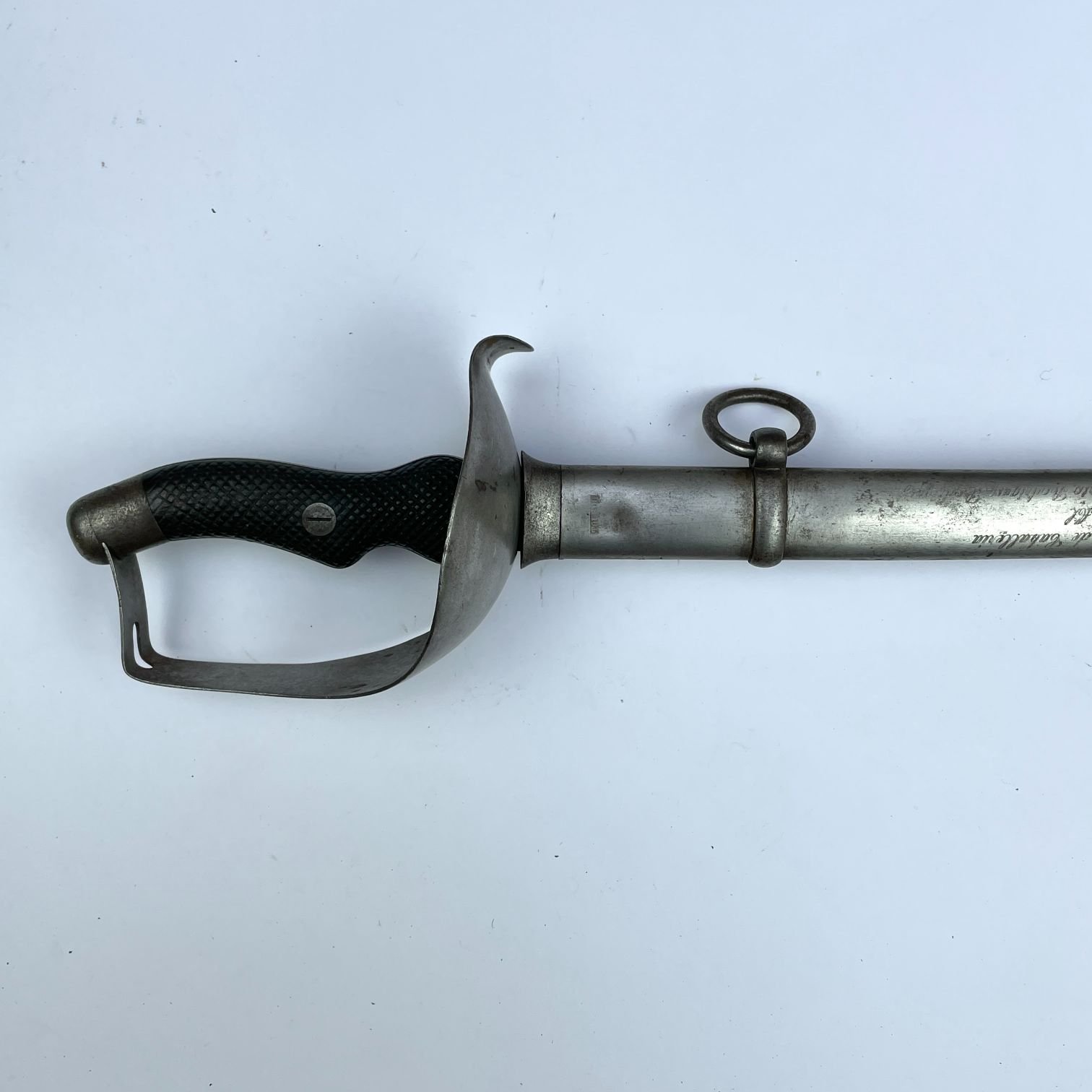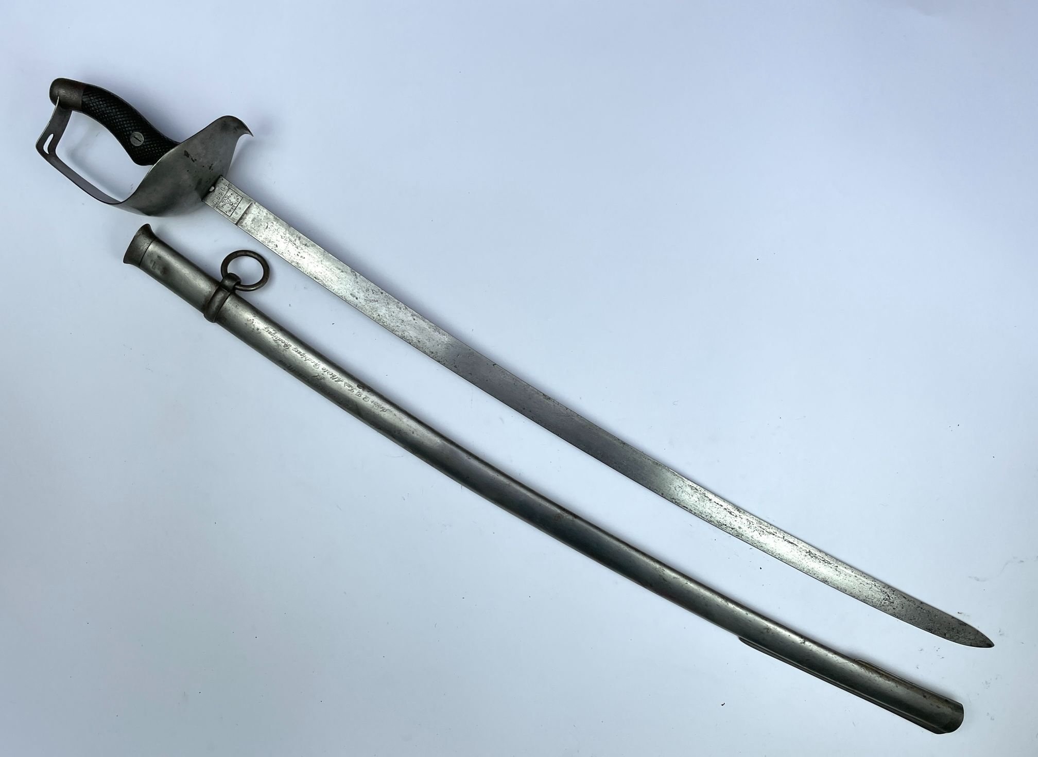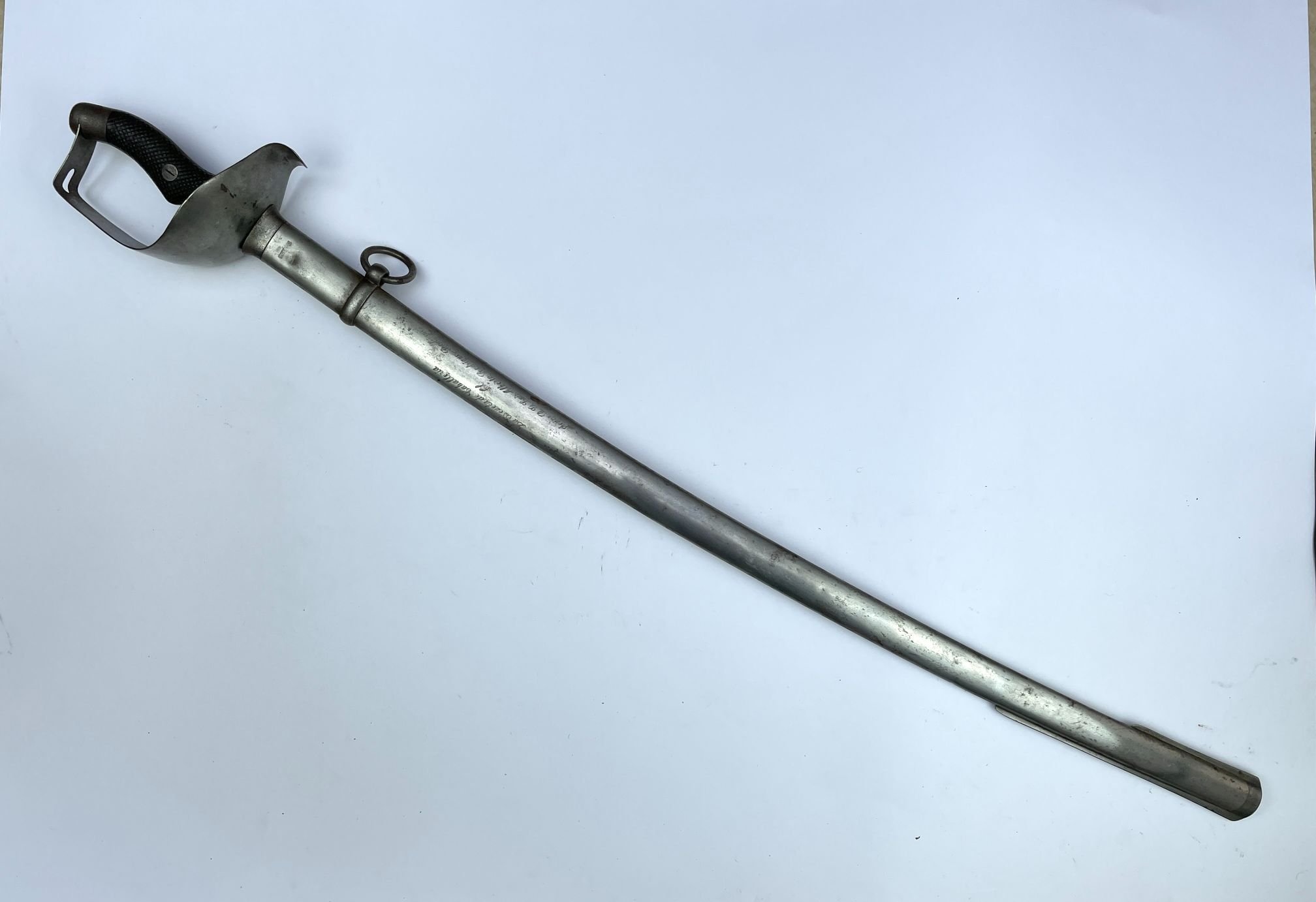 Sable colombiano para caballería. Cazoleta en acero liso. Empuñadura ergonómica en madera segrinada. Fabricado para el Ejército Colombiano por la artillería Fábrica Nacional de Toledo. Vaina de una anilla, con dedicatoria grabada: «La Escuela de Caballería al Señor B. G. Luis Alberto Rodríguez Rodríguez”.