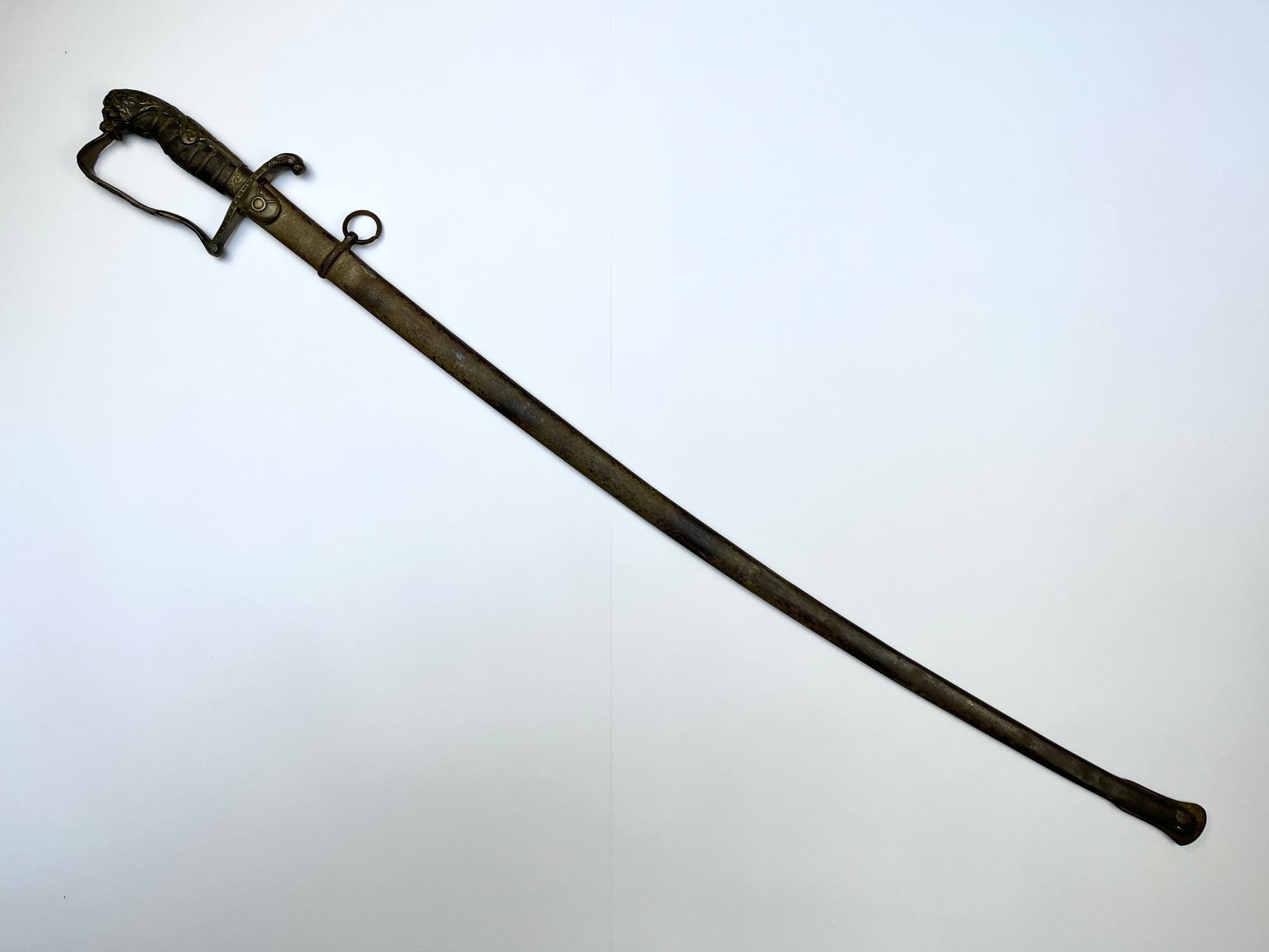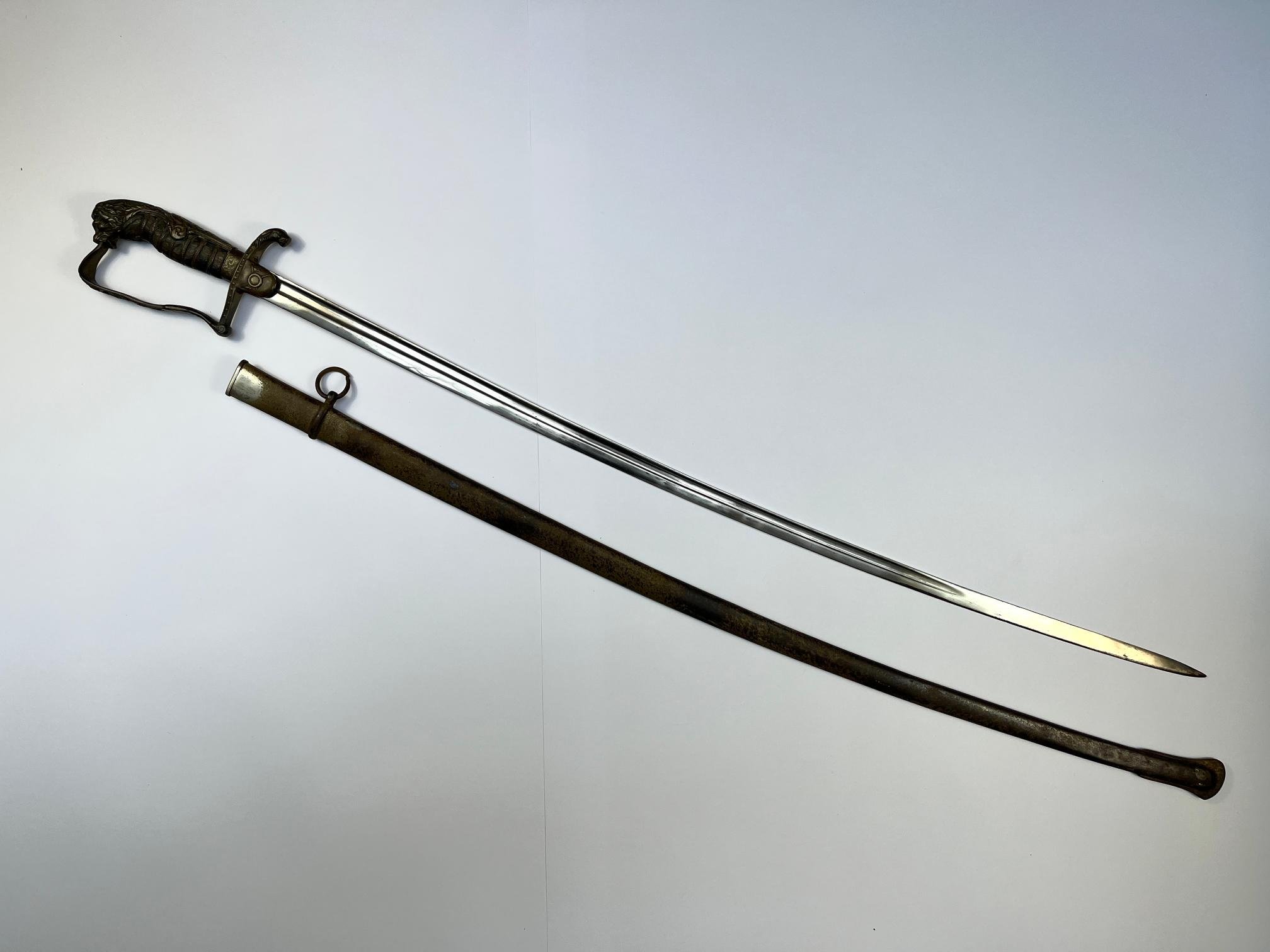 Sable de oficial de infantería uruguaya, modelo 1916. Guardamanos en bronce, con pomo esculturado «cabeza de león». Puño con torzal en alambre doble. Empuñadura con deterioro. Vaina metálica. Largo 102 cm.