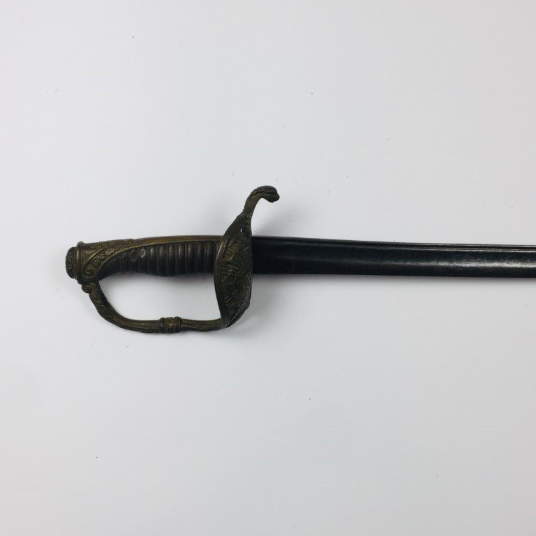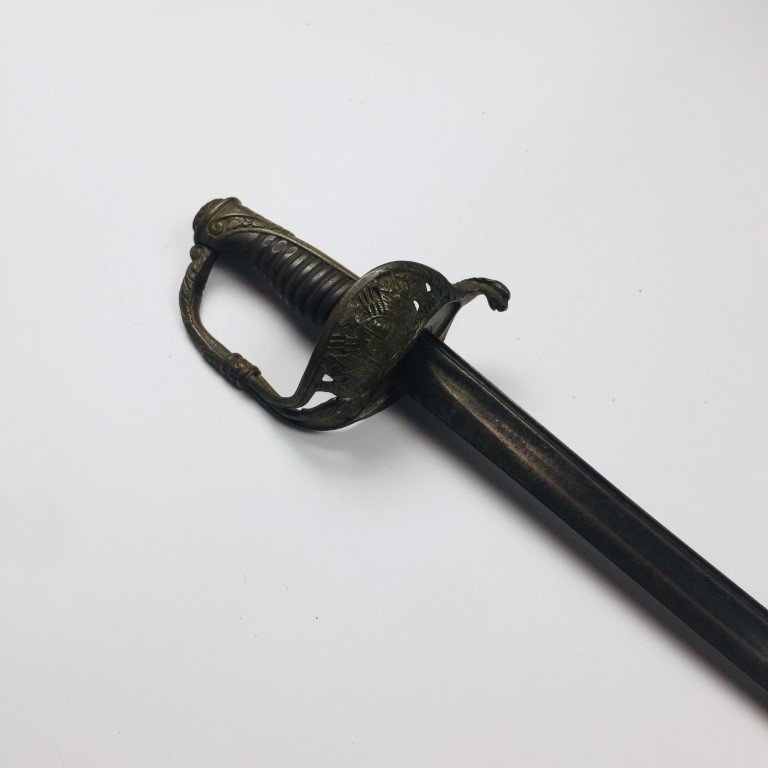 Sable francés modelo 1850, realizado para el ejército uruguayo. Hoja grabada al ácido «arabescos». Empuñadura en guampa con filigrana en bronce. Cazoleta en bronce calado y cincelado «escudo de armas uruguayo antiguo». Tipo de arma que fuera utilizada en la Guerra del Paraguay (1864-1870). Sin vaina. Largo total 86 cm.