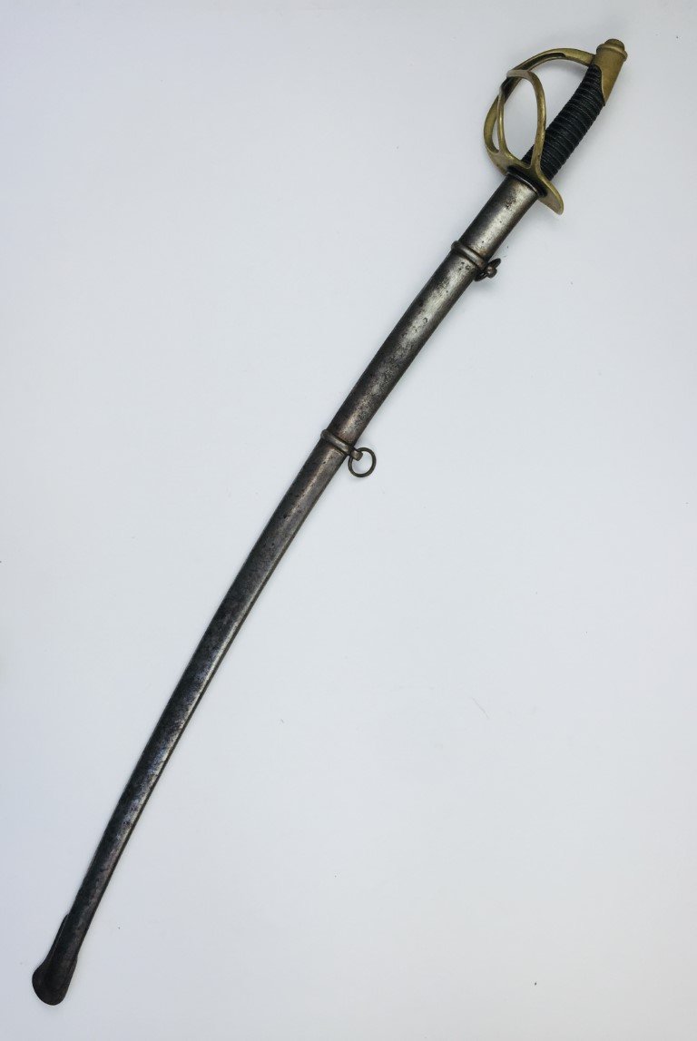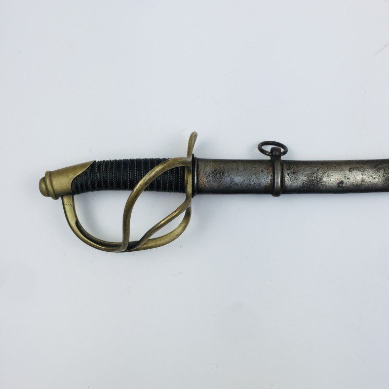 Sable francés para caballería ligera modelo 1822. Fabricado por Françoise Delacour. Empuñadura forrada en cuero, con filigrana en bronce. Guardamano en bronce. Vaina en hierro con dos anillas. Largo total 104 cm.