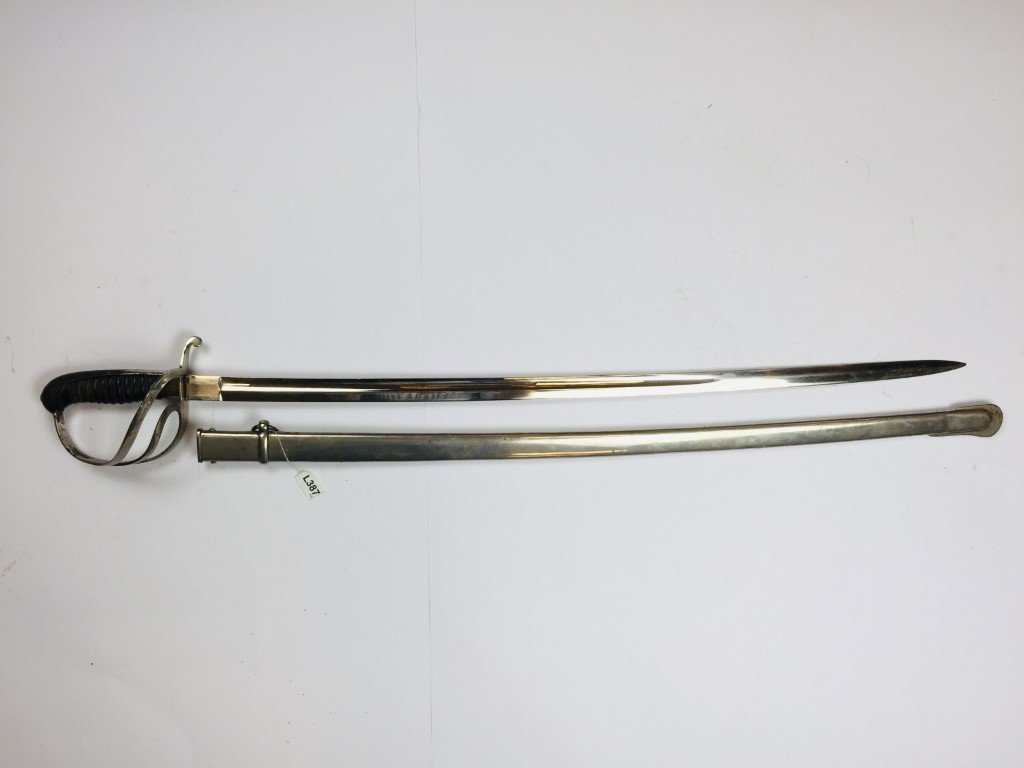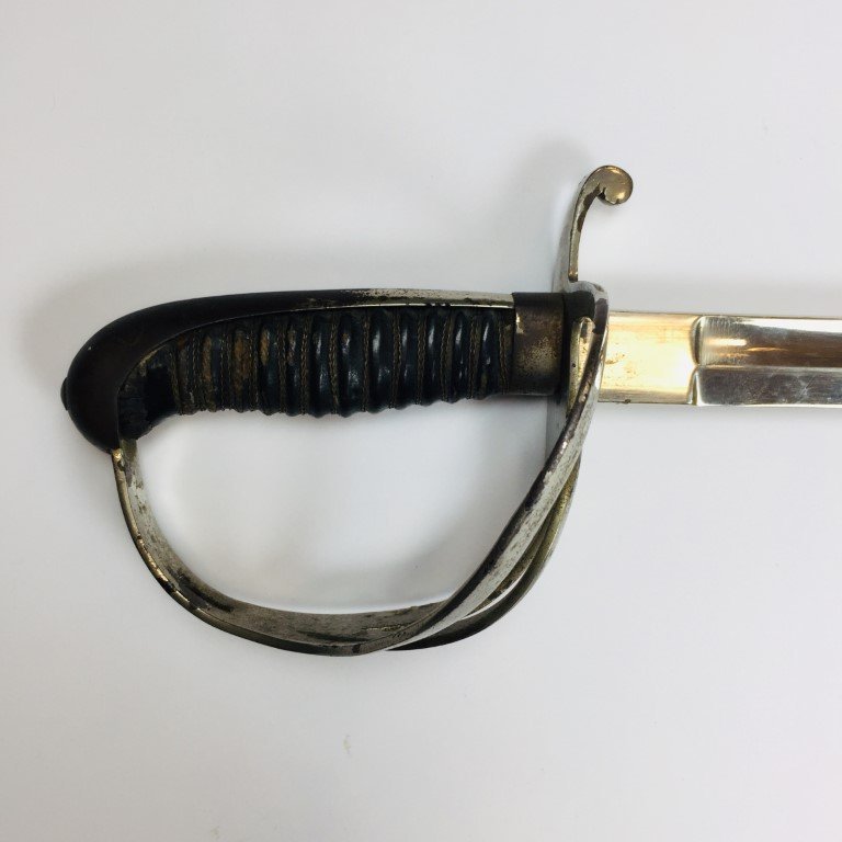 Sable francés curvo modelo 1882. Empuñadura en madera forrada en cuero, averiado, guardamano en tres ramales en metal niquelado y vaina en metal niquelado, con una anilla. Utilizado por oficiales del Ejército Uruguayo a fines del siglo XIX.