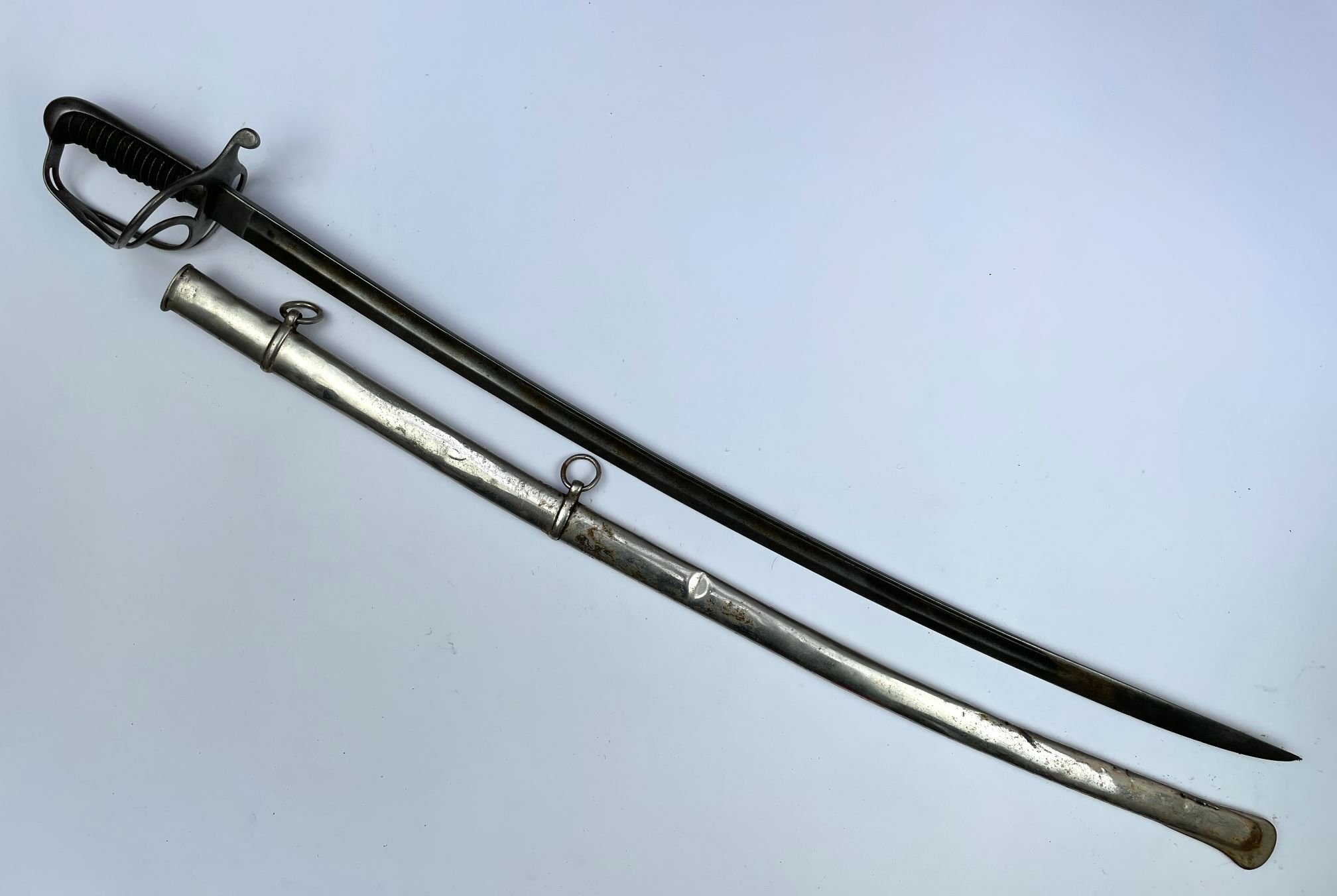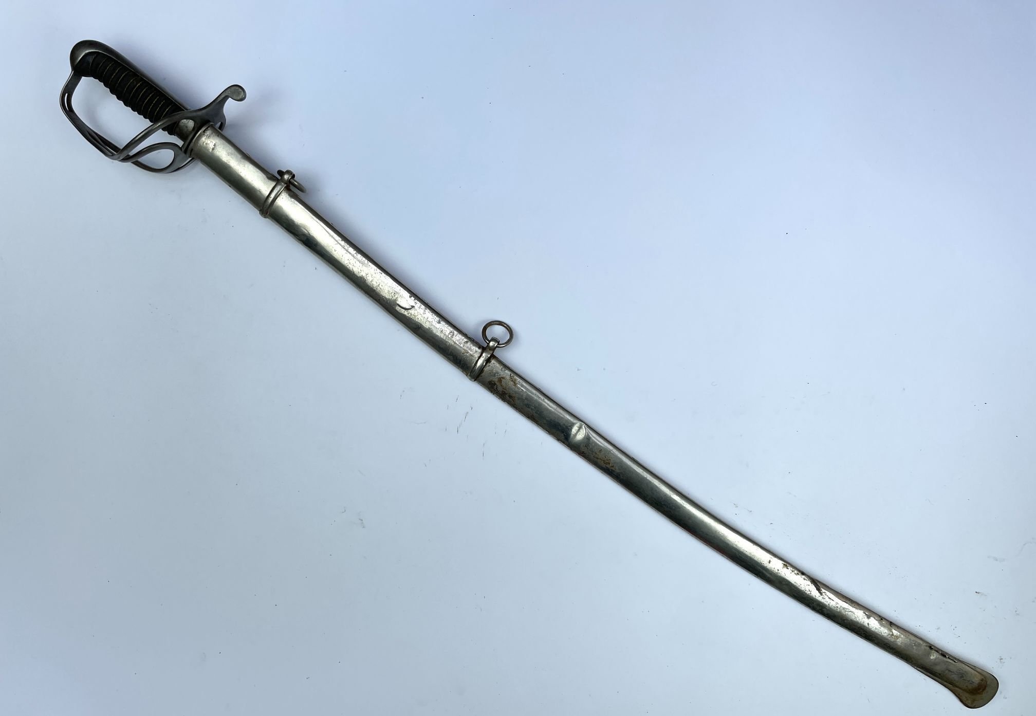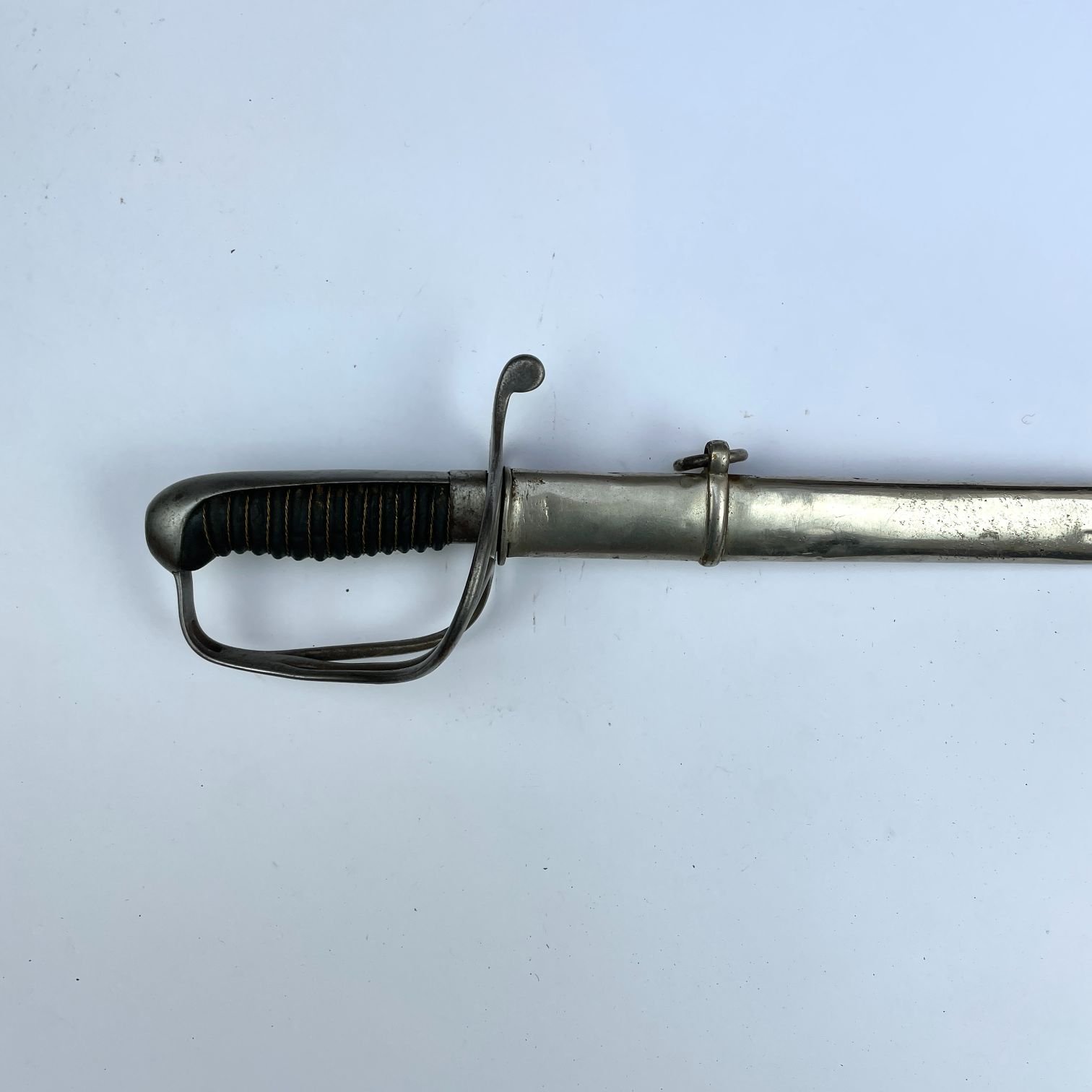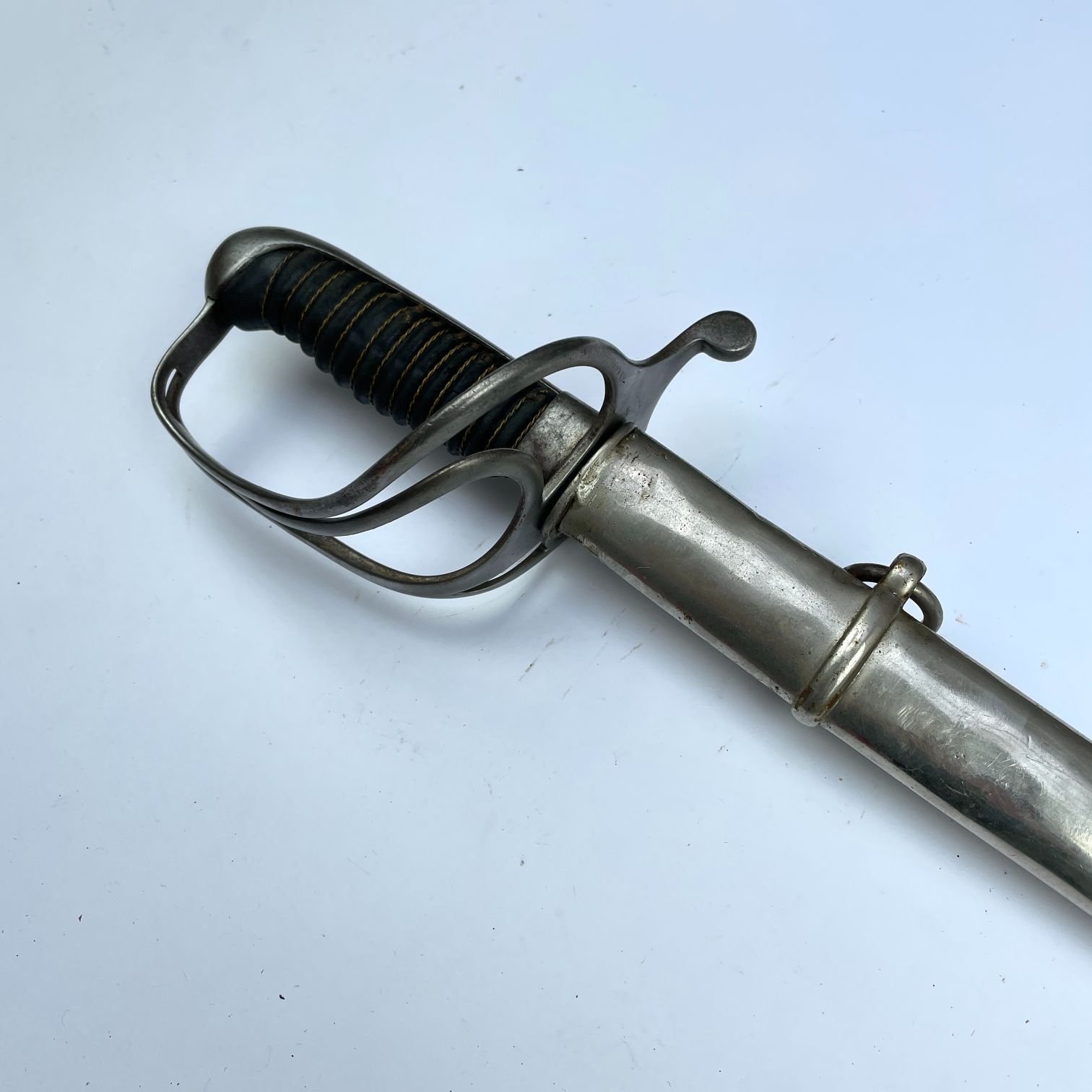 Sable francés modelo 1882. Guardamano de tres ramales. Empuñadura forrada en cuero con filigrana en bronce. Vaina de dos anillas.