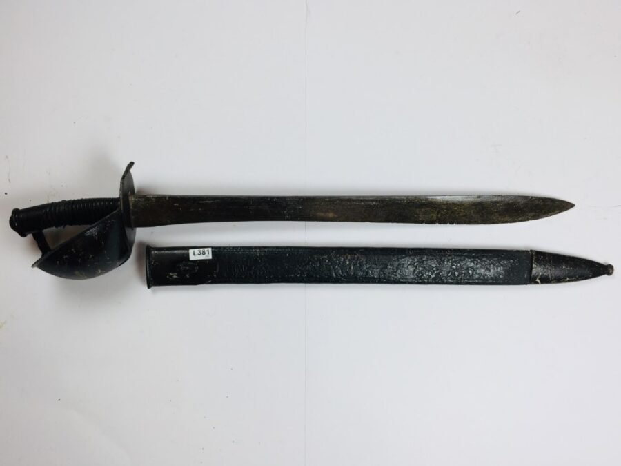 Sable francés de abordaje, siglo XIX. Empuñadura forrada en cuero con filigrana de bronce, averiada, cazoleta en hierro y vaina picasa en cuero con puntera y bocavaina en hierro. Largo total 77 cm.