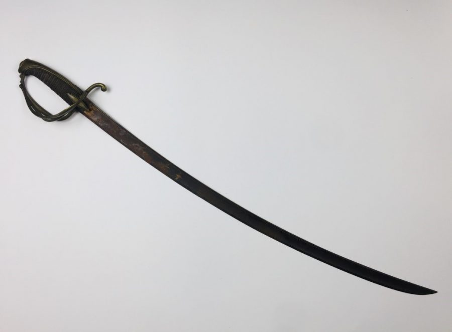 Sable napoleónico para oficial de caballería ligera. Hoja curva con sección nielada, grabada «motivos militares» y «hojas» con destaques en oro. Empuñadura forrada en piel de raya, con filigrana en bronce. Guardamano en bronce de tres ramales. Marcada en la hoja por el fabricante Coulaux Frères, Klingenthal. Sin vaina. Largo total 95 cm.