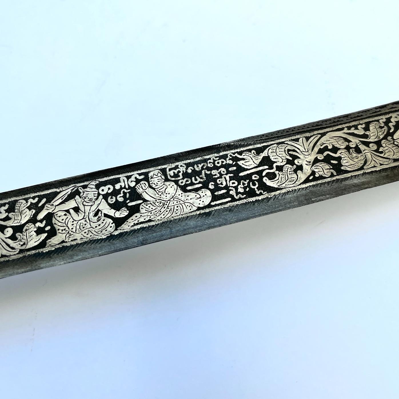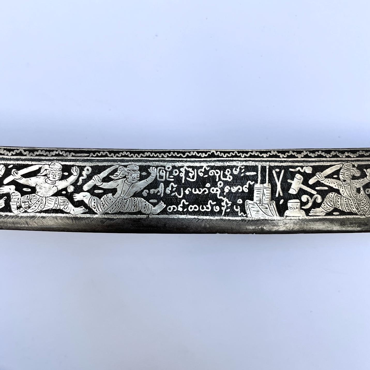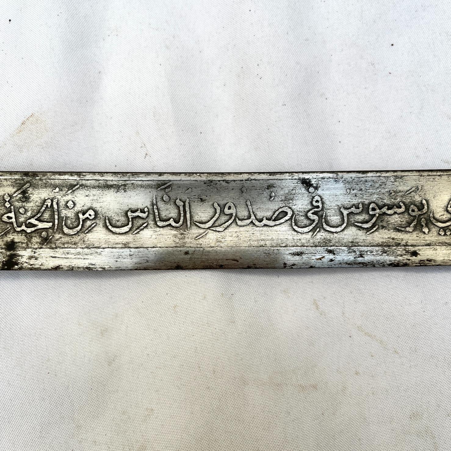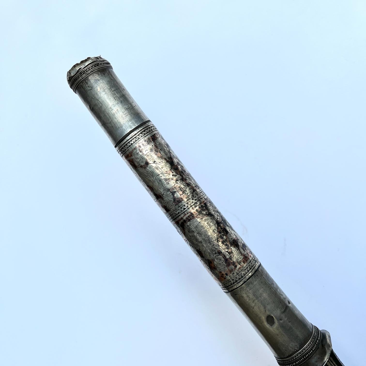 Sable persa. Hoja con incrustaciones en plata, decorada «guerreros» e inscripciones. Cabo en plata lisa, con detalles pavonados, decorado «personajes». Vaina en madera, con bocavaina, pasador y puntera en plata y esmalte, decorados «hojas». Largo 89 cm. Vaina averiada.