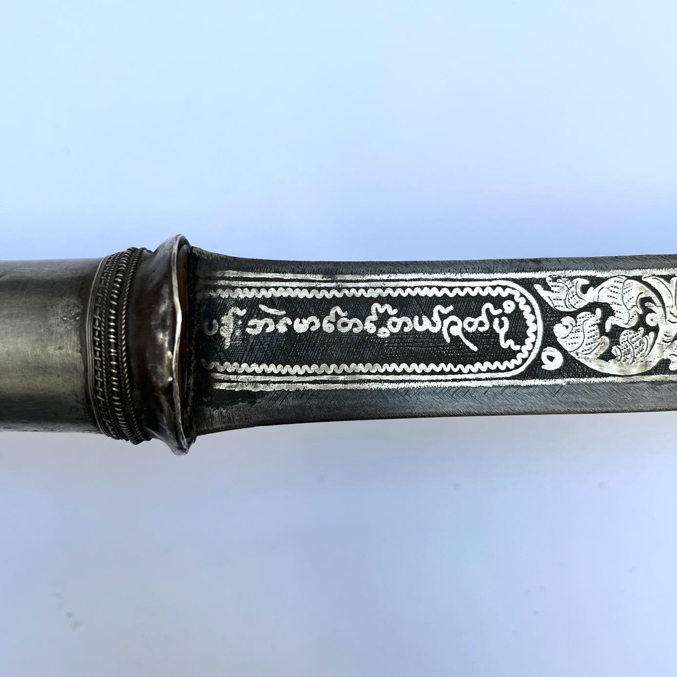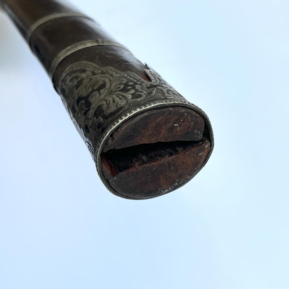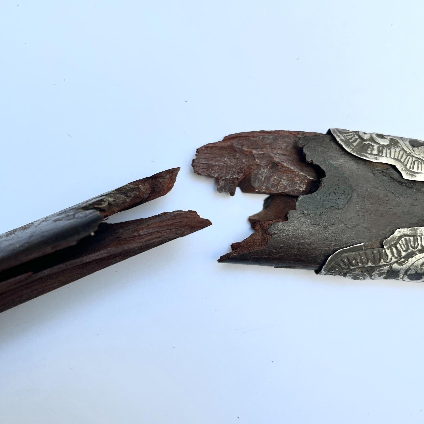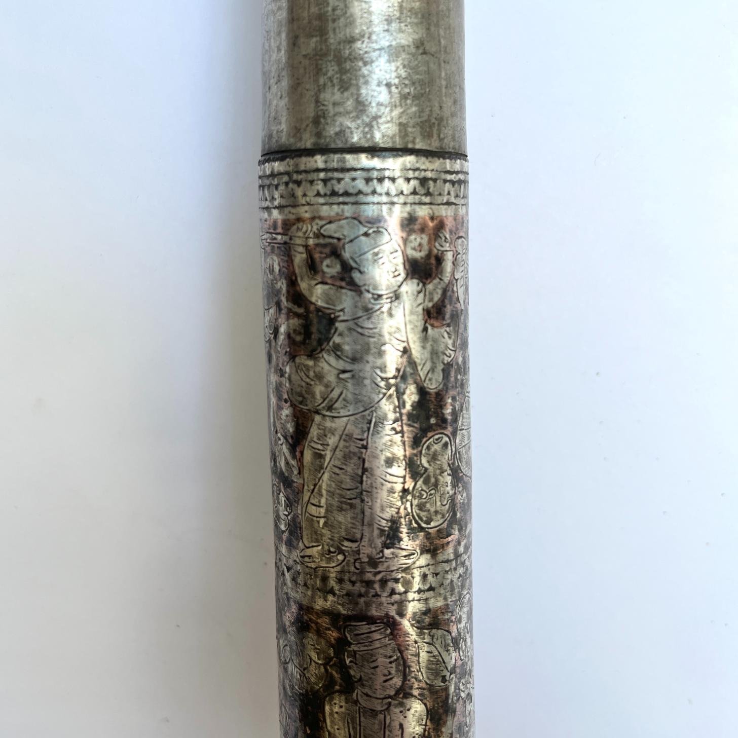 Sable persa. Hoja con incrustaciones en plata, decorada «guerreros» e inscripciones. Cabo en plata lisa, con detalles pavonados, decorado «personajes». Vaina en madera, con bocavaina, pasador y puntera en plata y esmalte, decorados «hojas». Largo 89 cm. Vaina averiada.