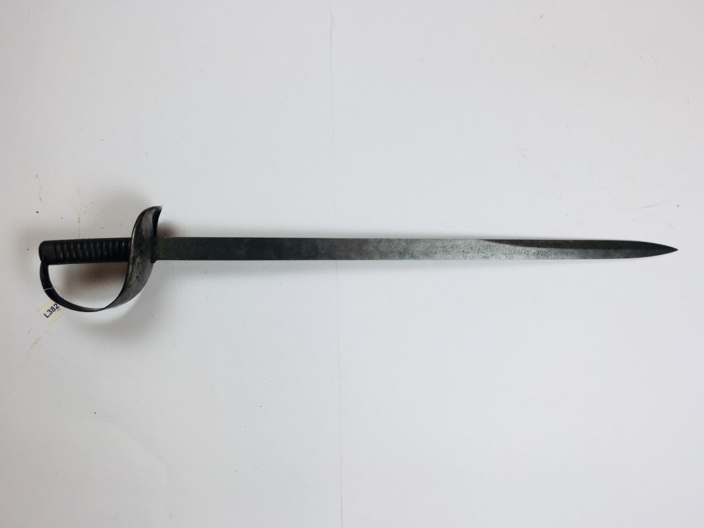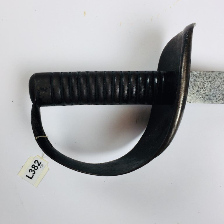 Sable recto de abordaje de la marina británica, modelo 1889. Empuñadura y cazoleta en metal con restos de pintura color negro, con cuños de ordenanza, letras del inspector y letra N de «Navy». Sin vaina. Fabricado por Wilkinson, Londres.