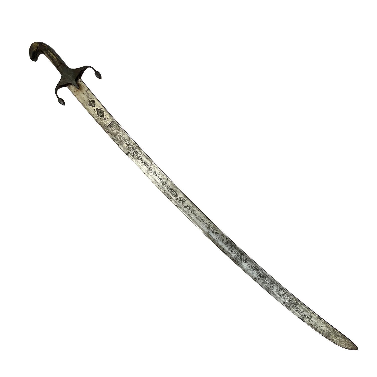 Sable turco otomano tipo Kilij, s. XIX. Hoja grabada al ácido con frases en árabe y punzones del espadero. Empuñadura en hierro forjado con cachas en guampa de búfalo. Vaina en madera forrada en cuero negro, restaurada. Largo 100 cm.